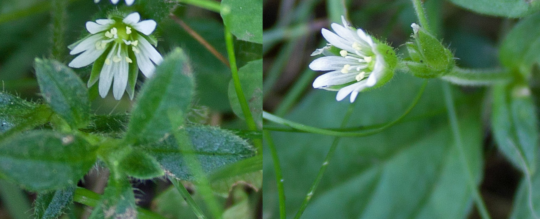 Common Chickweed (Stellaria media) is a small edible plant with dainty white flowers in pairs of two. Several ways to identify this spreading plant, aside from the highly lobed five petals (that look like 10 petals), is by the single line of hairs on the stem and what Backyard Edibles describes as the ‘elastic band effect when you pull apart the stem.’ This last diagnostic is wild to try!