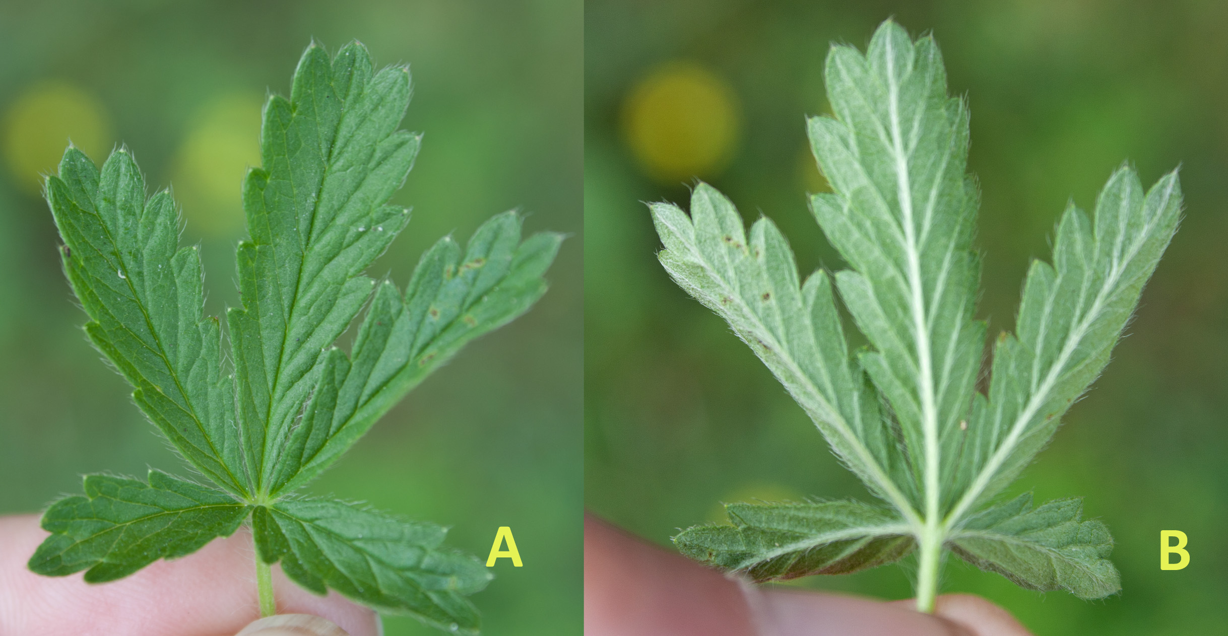 If a lawn is left not mowed for longer, another cinquefoil will grow. The native Common Cinquefoil (Potentilla simplex) is taller than the Silvery Cinquefoil, with prostate stems, rooting at the nodes. It can be distinguished from the smaller Dwarf Cinquefoil by the shape of its leaves (more elongated vs wedged-shaped). Its leaves do not show the diagnostic silvery hairy underside of Silvery Cinquefoil either.