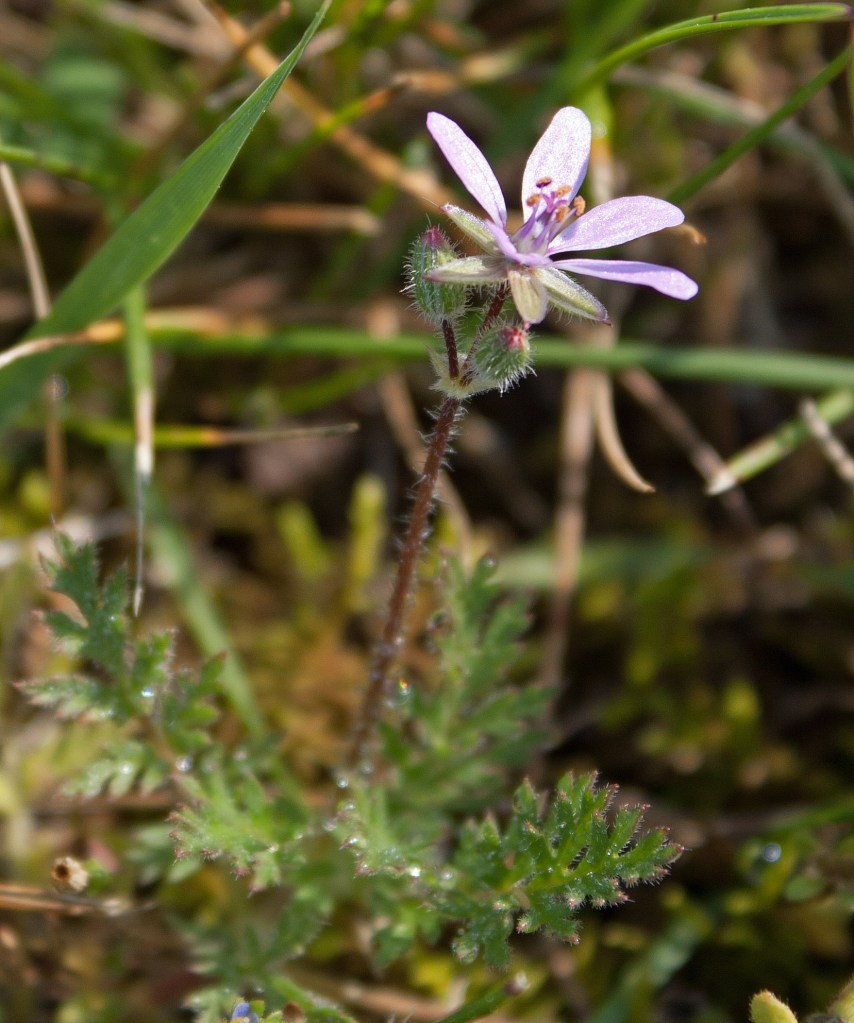 Common storksbill (Erodium cicutarium) is a tiny pink five-petal flower whose leaves, flowers, roots, and stems are edible. The young leaves, which look like parsley leaves in fact taste like parsley if picked young. I found them nestled among black medick and young yarrow and clover in a public lawn by the Rotary Trail. The beautiful tiny pink flowers that grew out of a deeply lobed leafy rosette caught my attention first. The stems are reddish and hairy. According to Specialty Produce, the flowers vary from gorgeous pink–as I saw them–to electric violet. The flowers have 5 petals, 5 styles and 10 filaments, blooming in clusters of 2 to 3 flowers. The plant gets its name from the long, slender pointed seed pods. As these needle-like seed pods dry, increased tension eventually causes the pod to explode, launching the seeds into the air.