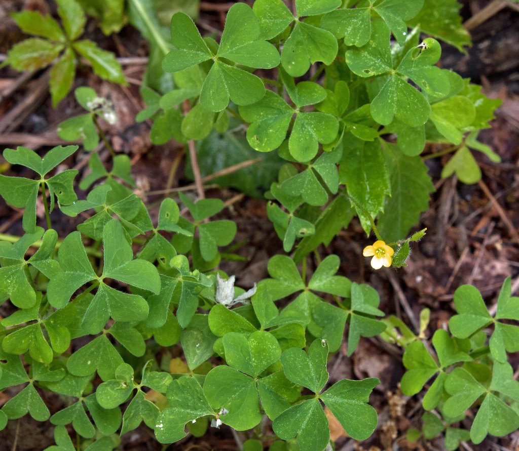 Yellow wood sorrel (Oxalis stricta) is a delicate low-growing spreading plant with yellow flowers and shamrock-like leaves, which are both edible. I didn’t find it in my or other lawns, but did see it beside the trail I walk past my lawn. All parts of the wood sorrel are edible: leaves, flowers, seed pods, and roots. They can be eaten raw or cooked. The leaves contain oxalic acid, which gives them a sharp lemony flavour, and why some call it sourgrass; note that spinach and broccoli also contain oxalic acid. The tart flavour of wood sorrel goes well with meat and fish. Wood sorrel is high in vitamin C and can be used to treat scurvy. It is also beneficial for treating influenza.