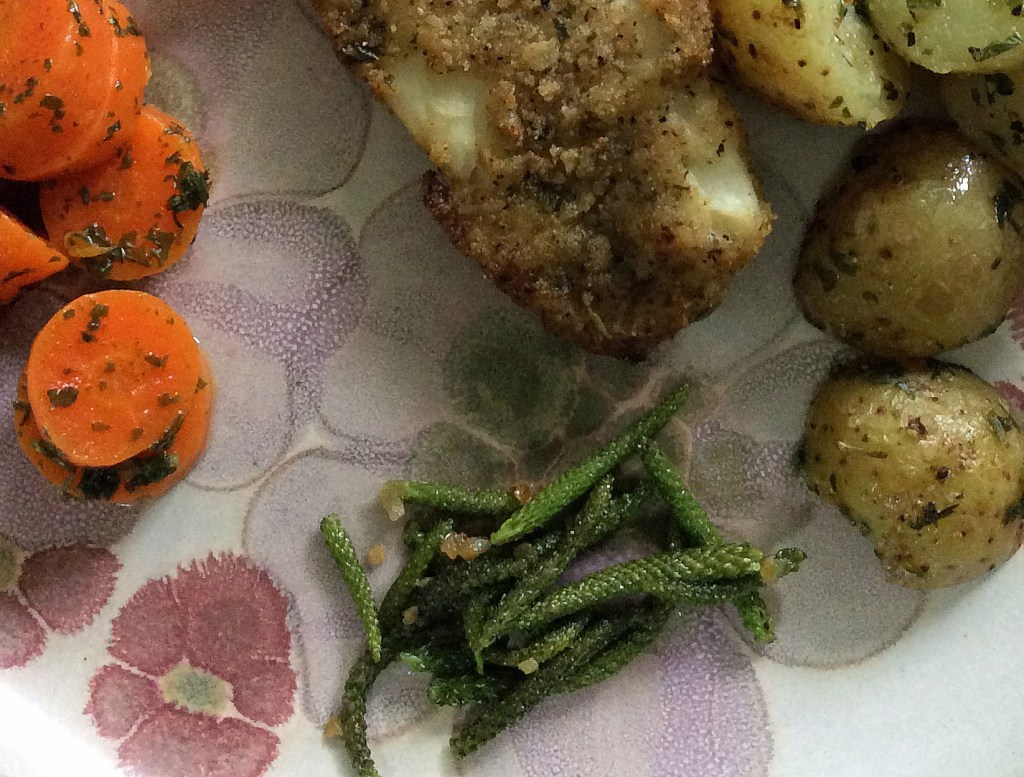 After collecting a dozen or so flower shoots, I rinsed them then added them to butter and garlic in a skillet and lightly stir-fried them. Then I served them with breaded haddock, carrots and roasted potatoes. I was astounded by how good they were! Lemony with a hint of pepper and a nutty after taste. So good! I will have these again.