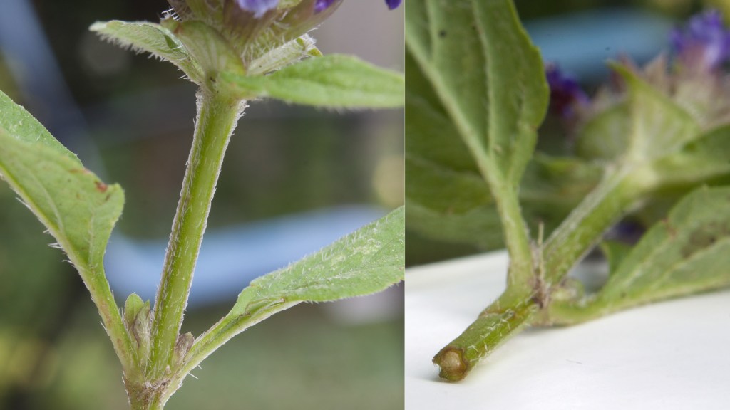 The stems are square (try rolling the stem between your fingers; you’ll feel the squareness) with a reddish to green hairy calyx. Leaves are sparsely opposite egg- to lance-shaped.