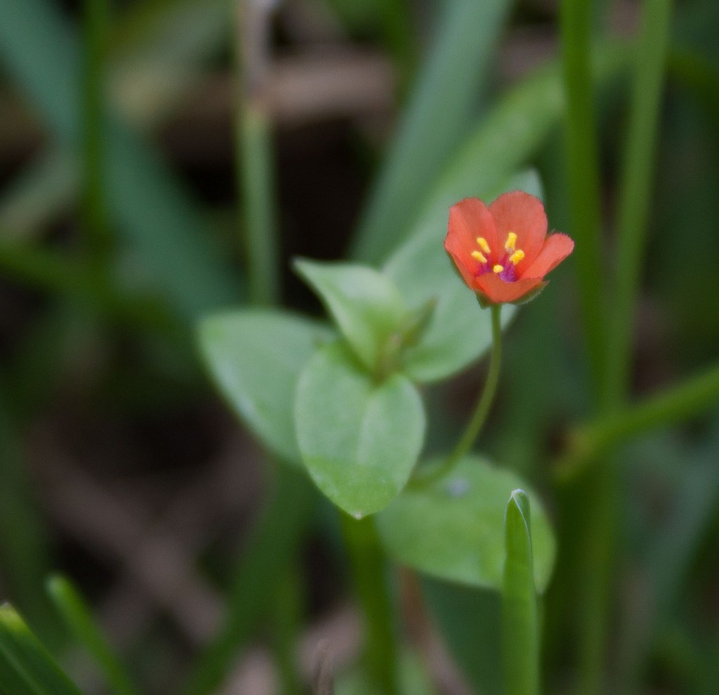 I stumbled across the Scarlet Pimpernel (Anagallis arvensis) by noticing the intense orange colour of this tiny 5-petal flower (smaller than my baby fingernail). Also known as red chickweed or shepherd’s clock (because the flowers only open in bright sunlight), this low-growing creeping annual with square stems also has a blue variety, though less common. Rising out of the centre of five bright orange petals are brilliant stamens with bright pink filaments and yellow anthers. Part of the primrose family (Primulaceae) the pimpernel grows in sunny lawns and fields and along the verges of salted roads and disturbed areas.