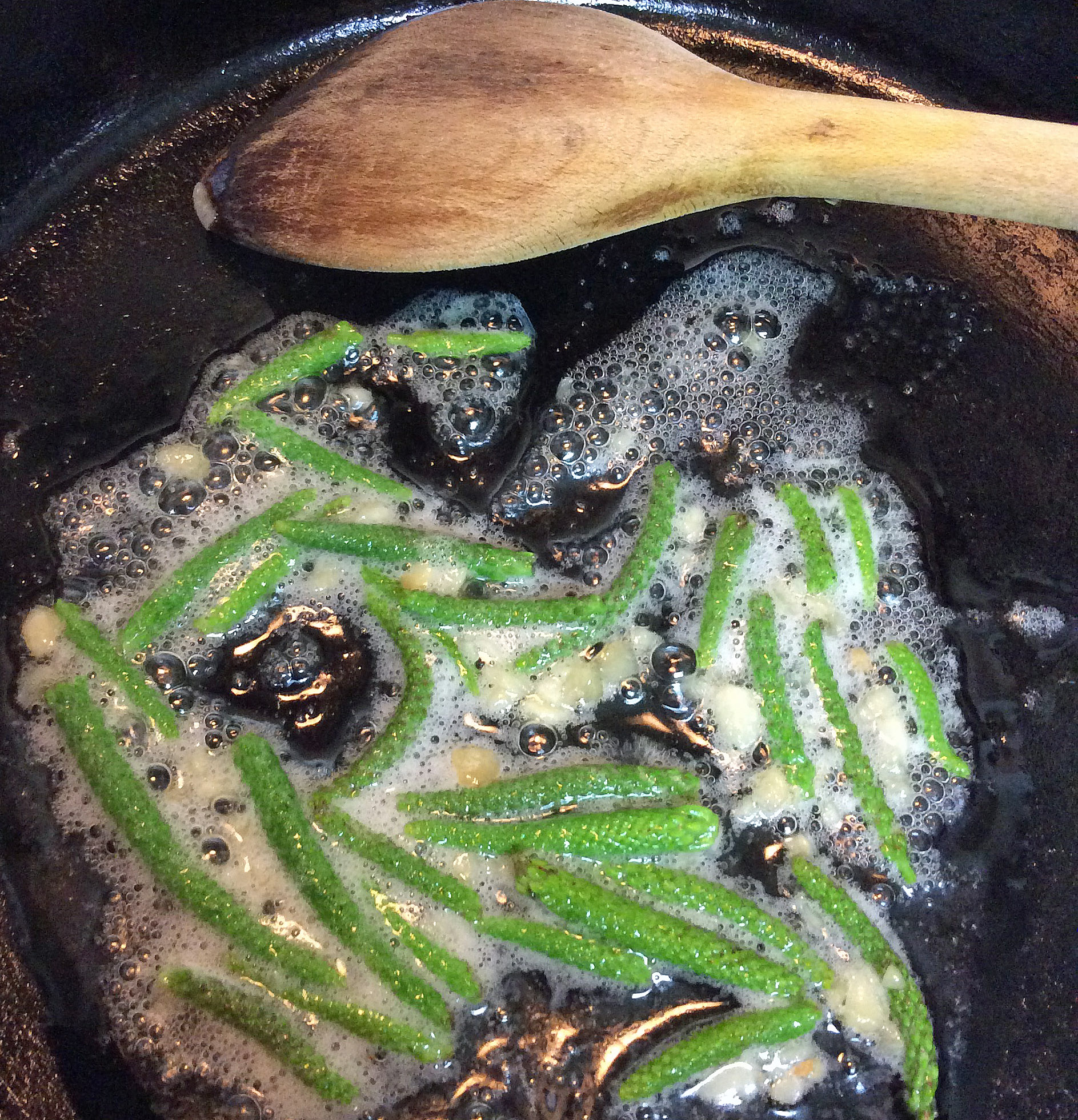 Within a week of seeing Wilderstead’s video, several broadleaf plantain plants flowered and I was able to collect enough young flower shoots to fry up my own.