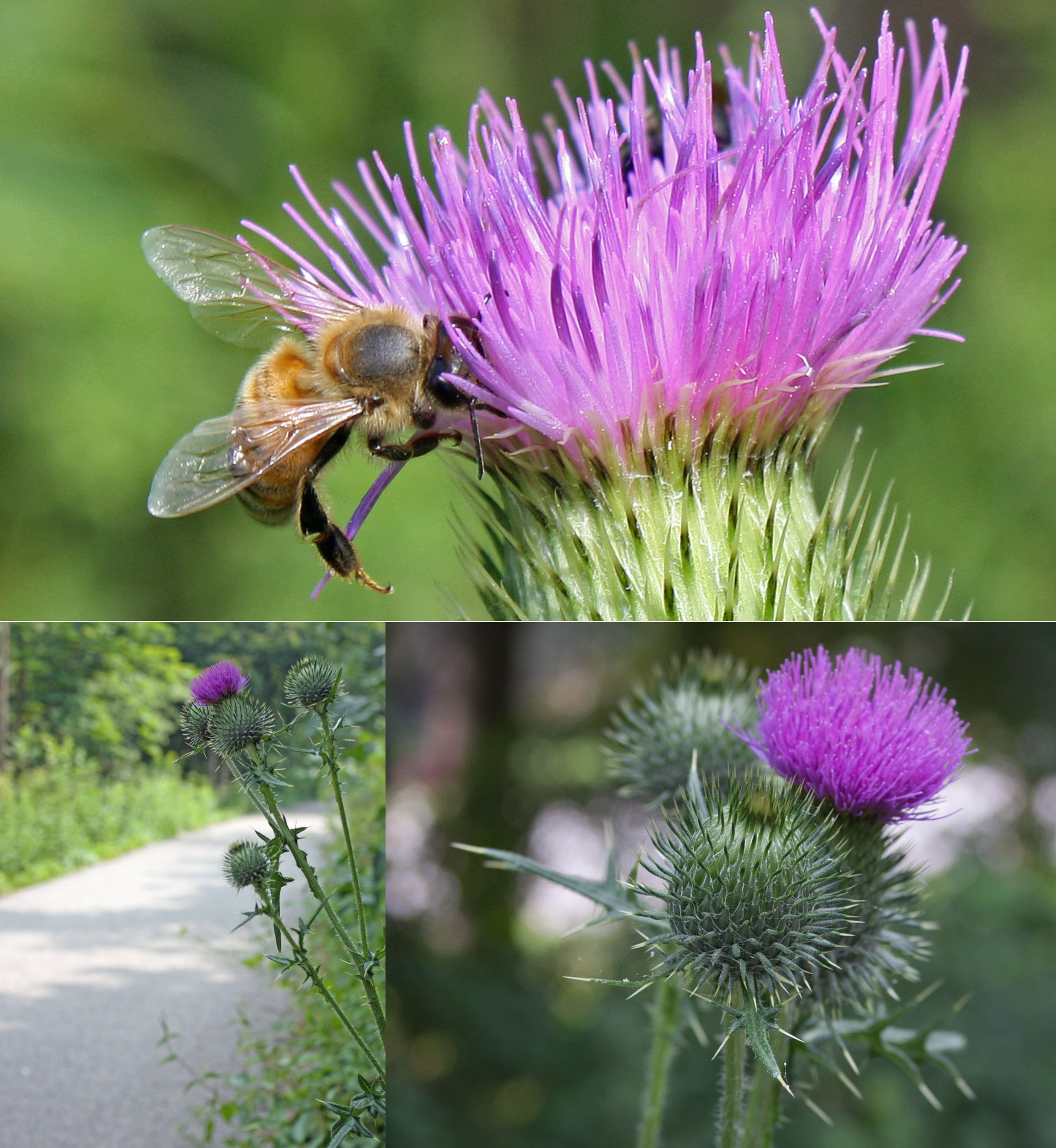 Bull thistle provides abundant nectar for pollinators of all sorts; American goldfinch eats the seeds and uses the thistle down (the pappus) to line its nest.