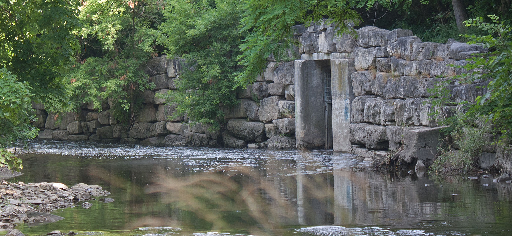 The walk upstream from the creek mouth was pleasant, much of it through riparian mixed deciduous forest of mostly maple, black walnut, basswood, willow, and oak; and, of course, alder. An old stone wall lined one curved section of the creek and main trail. I noted what looked like a stone gate at the bottom of the highest portion and then realized that it was a storm sewer conduit. We passed beneath the GO Train rail bridge, a reminder of the proximity of busy urbanization.