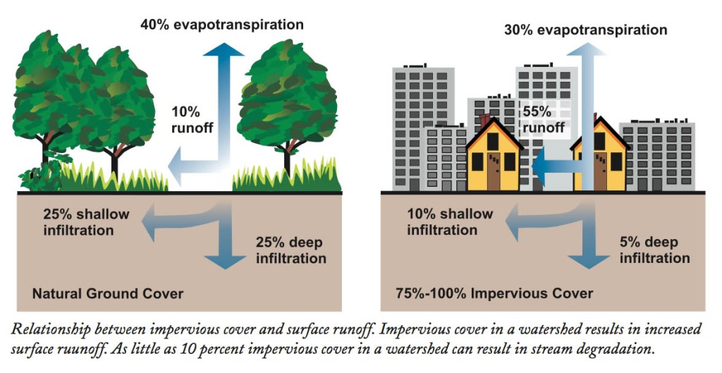 The EPA tells us that “because of impervious surfaces like pavement and rooftops, a typical city block generates more than 5 times more runoff than a woodland area of the same size.