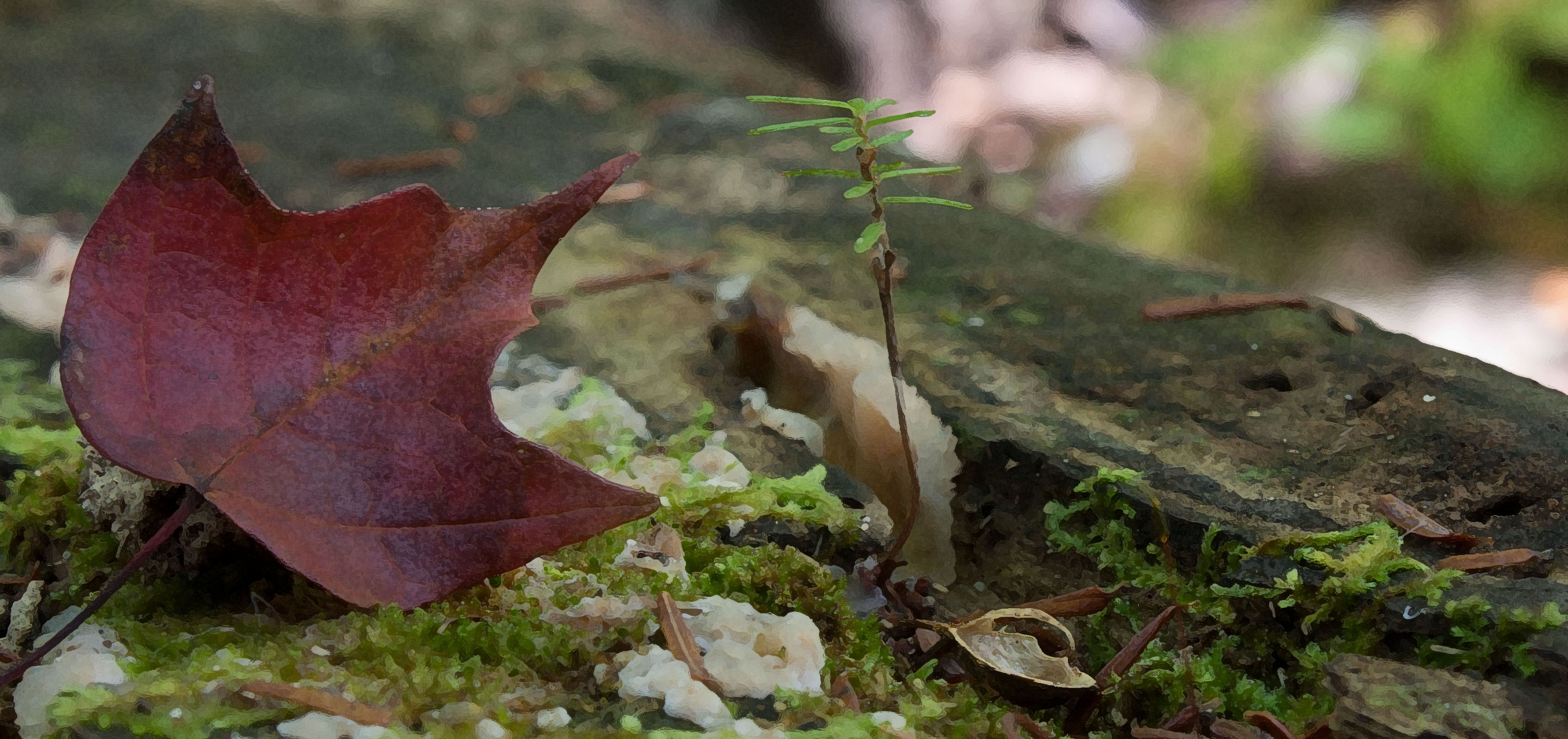 In the hush of a great threshold, Nature holds its breath and a leaf settles in the arms of a cedar root.