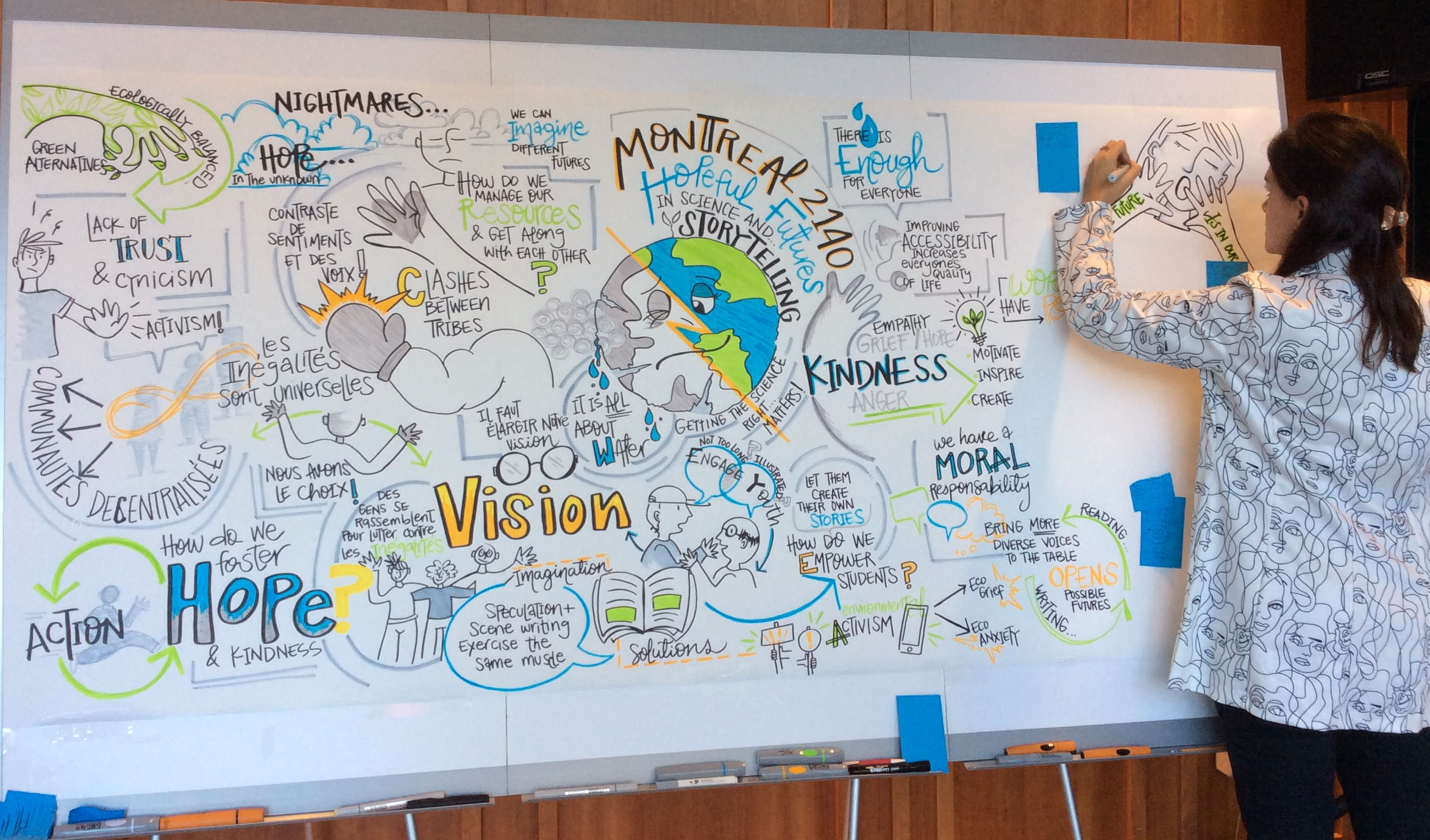 At every turn, I made contacts across disciplines and interests and had stimulating and meaningful conversations. I discovered many hopeful ‘stories’ of Montreal and elsewhere on hopeful visions and endeavors. These included “Seeds of good Anthropocenes” (small ground-rooted projects and initiatives aimed at shaping a future that is just, prosperous, and sustainable); turning scientific research into hopeful stories; and world building as resistance.