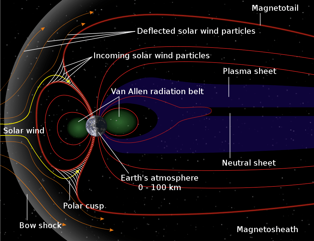 The earth’s magnetosphere is the space region dominated by its magnetic field. It forms an obstacle in the path of the solar wind, causing it to be diverted around. When the solar wind is “perturbed”, it transfers energy and material into the magnetosphere. The electrons and ions in the magnetosphere that become energized move along the magnetic field lines to the polar regions of the atmosphere.