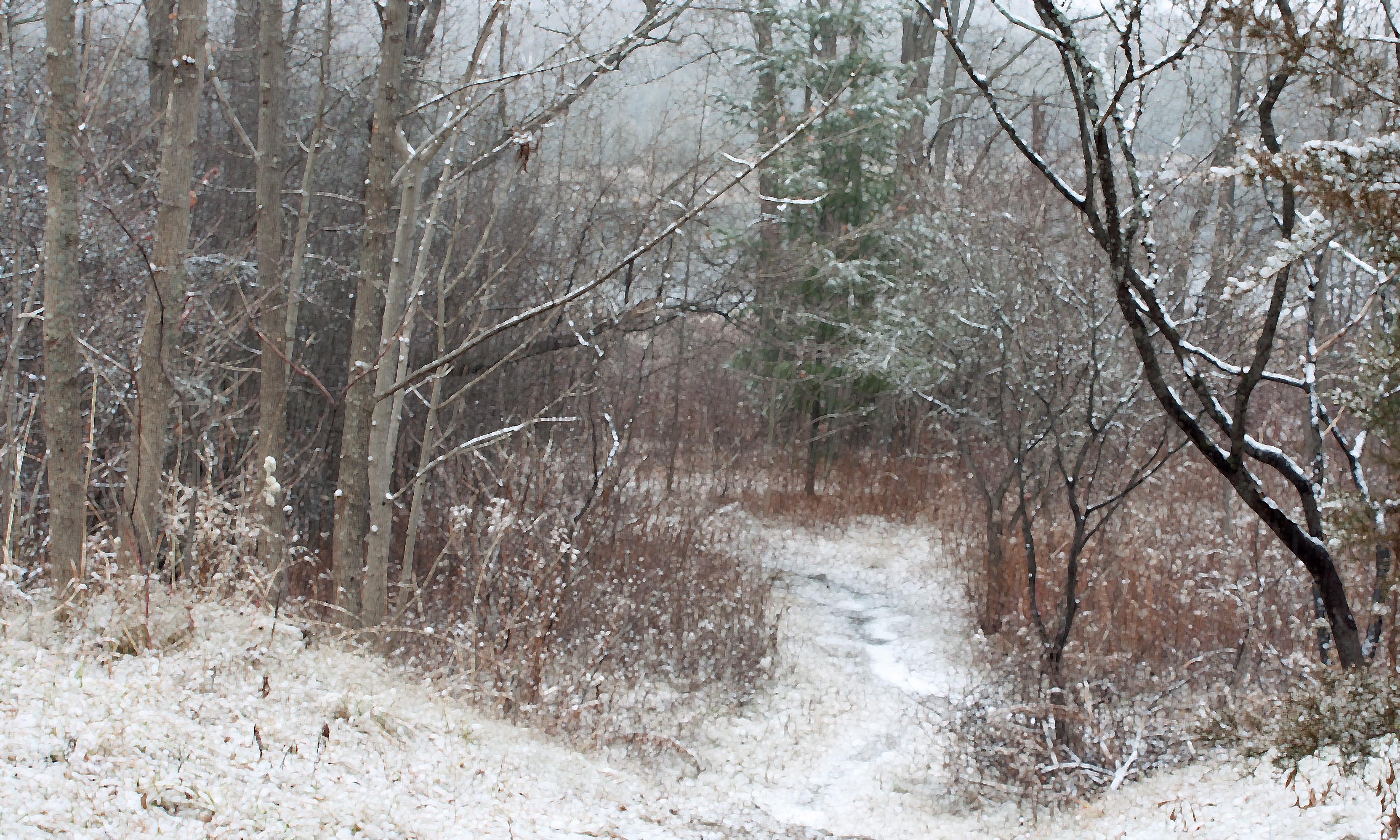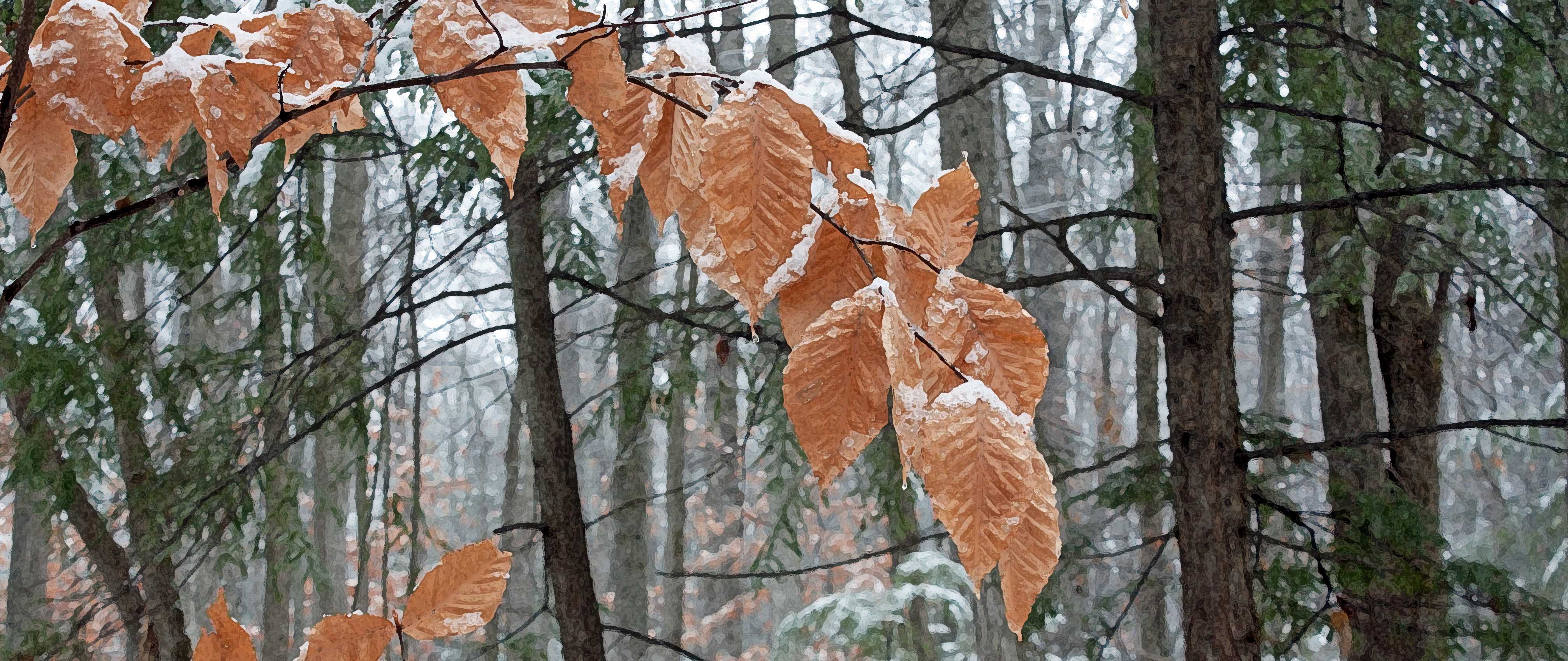 Marcescent beech leaves are covered in snowfall that never seems to end, South Drumlin Park, ON (photo and rendition by Nina Munteanu)
