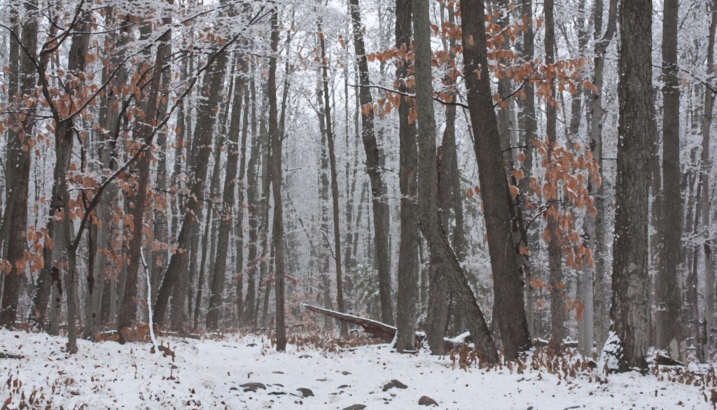 I was the only person there. I walked and crunched through snow and frost-hardened leaf litter and I let myself get lost in the labyrinth of trails through the open winter forest. The pale beech trees, because they keep their now copper-coloured marcescent leaves, stood out amid the bare maples, oaks, poplars and birch trees.