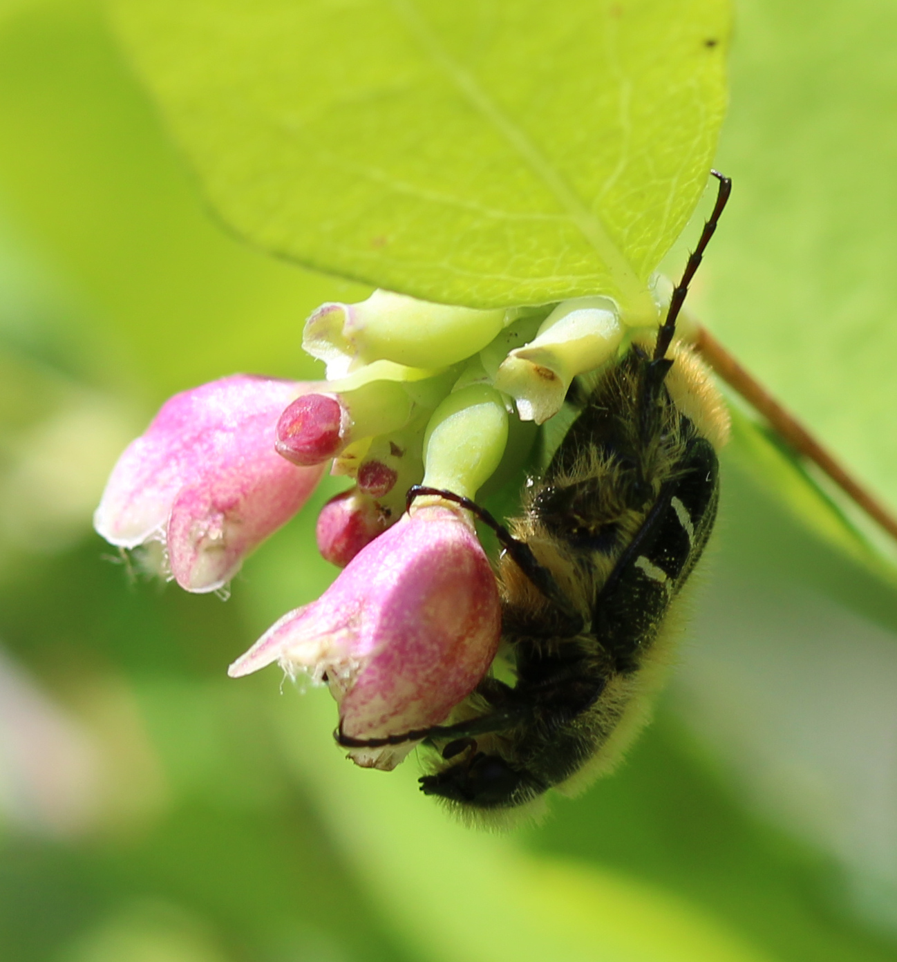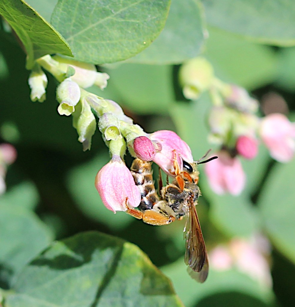 some native bees are specialists that require pollen from one family, genus, or even one species of plant. Lose the plants, you lose the bee. Lose the bee, you lose the plants. This summer, during the Native BC Bee Course, I was excited to photograph the bees that specialize on snowberry bushes in the south Okanagan. They are known as the all-blue shortface bees (Dufourea holocynaea). They depend on a good stand of snowberry shrubs to collect the pollen that they take down into the nests they build in the ground right next to the plants. The cuckoo bee (Neotrypetes) parasitizes these snowberry specialists, so they also depend on these snowberry plants.