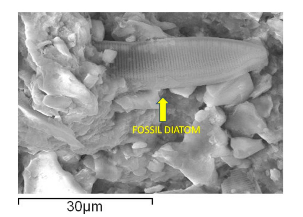 When the diatom dies, its tough shell of inorganic silica does not decompose; the silica cells remain preserved over time–up to millions of years. While everyone calls them fossils, they are not true fossils in that their original material–silica–is not replaced by another mineral.