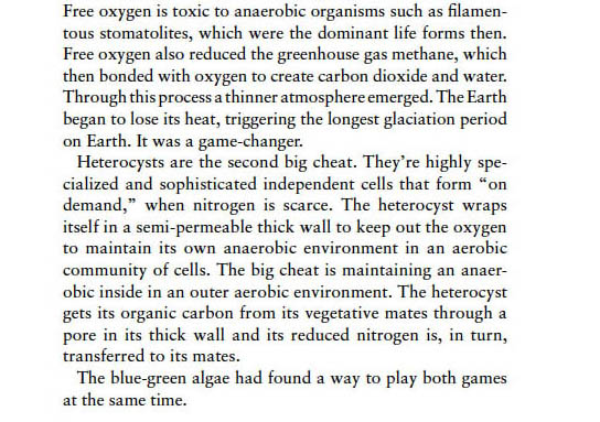 In my eco-fiction novel A Diary in the Age of Water the diarist, a cynical limnologist, describes the two “big cheats” of cyanobacteria (blue green algae)—of playing both sides—to dominate the world: