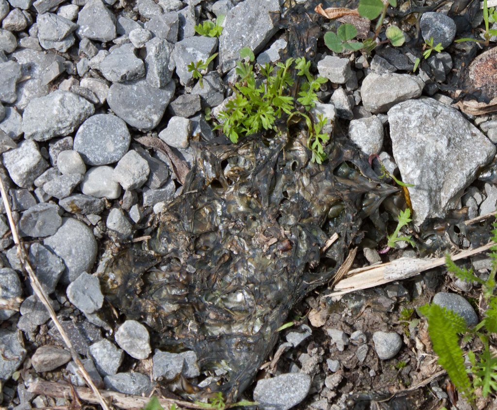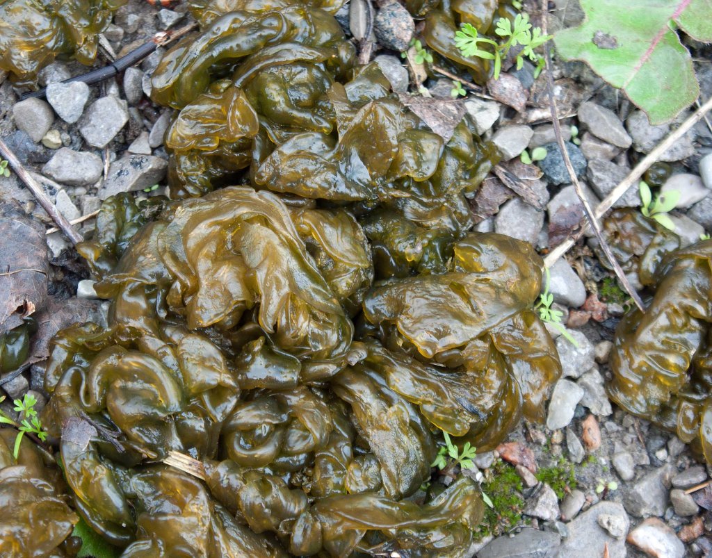 Close up of rubbery hydrated Nostoc commune on gravel road, ON (photo by Nina Munteanu)