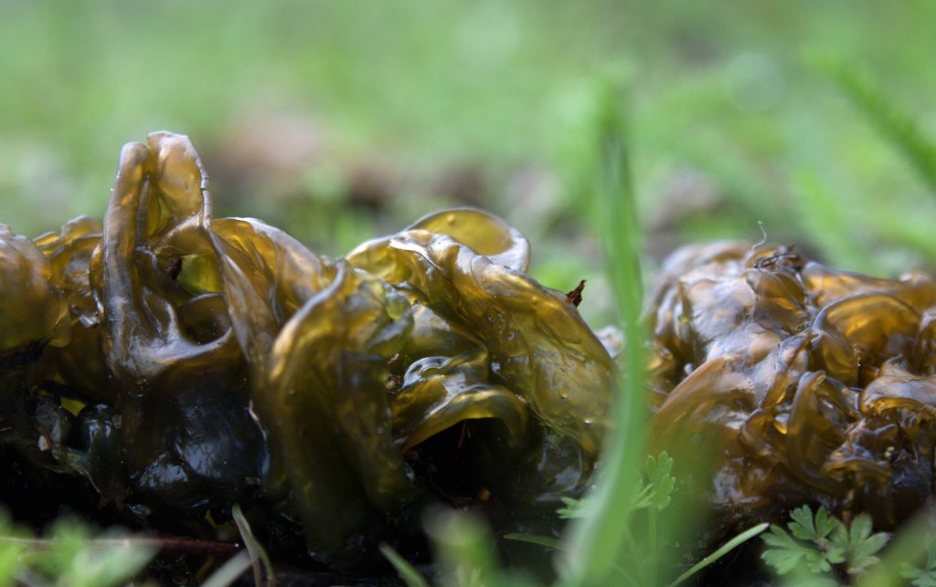 Nostoc commune appears to have many common names. It is called mare’s eggs, Táak-chak (‘rain-poop’ in Mayan) and facai (in China). Nostoc commune has also been called ‘witch’s butter’ like the jelly fungus (Tremella mesenterica). Joe Boggs at Buckeye Yard & Garden onLine of Ohio State University shares how the alien-looking and sudden appearance after a thunderstorm of hydrated Nostoc commune resulted in some strange names such as ‘star-jelly’, ‘star-shot’, and ‘star-slime’. According to the University of Florida, N. commune may also be called ‘ground boogers’ and ‘dragon’s snot’.