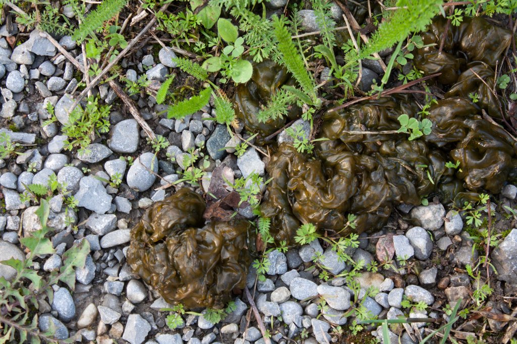 As soon as I stepped onto the gravel road, I spotted what looked like a pile of wet sloppy greenish-brown dog poo. I stepped over to the other road track and saw more of the slimy stuff. My first thought was “this poor dog has the runs!”; but when I spotted a long trail of this stuff over the gravel, my mind quickly amended. Time to check more closely. I bent down and, after gingerly touching its firm jelly-like surface, I realized that this was not poo at all. It was some kind of organism.