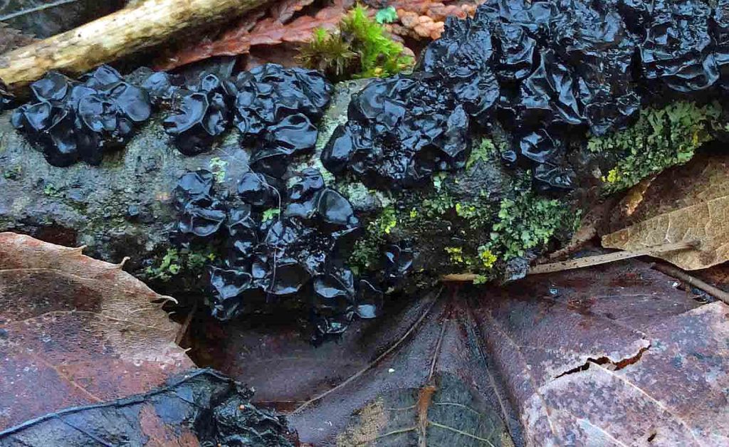 Jelly fungus Black Witch’s Butter (Exidia glandulosa) on a twig, Little Rouge River woodland, ON (photo by Nina Munteanu)