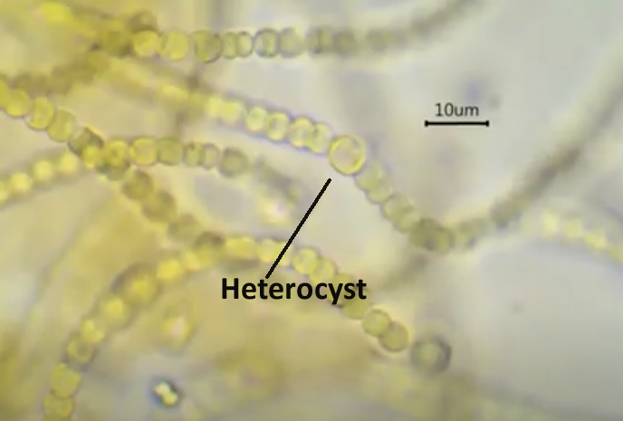 Microscopic view of Nostoc commune, showing heterocyst (screen capture from Alberto Mellappioni’s Youtube video)