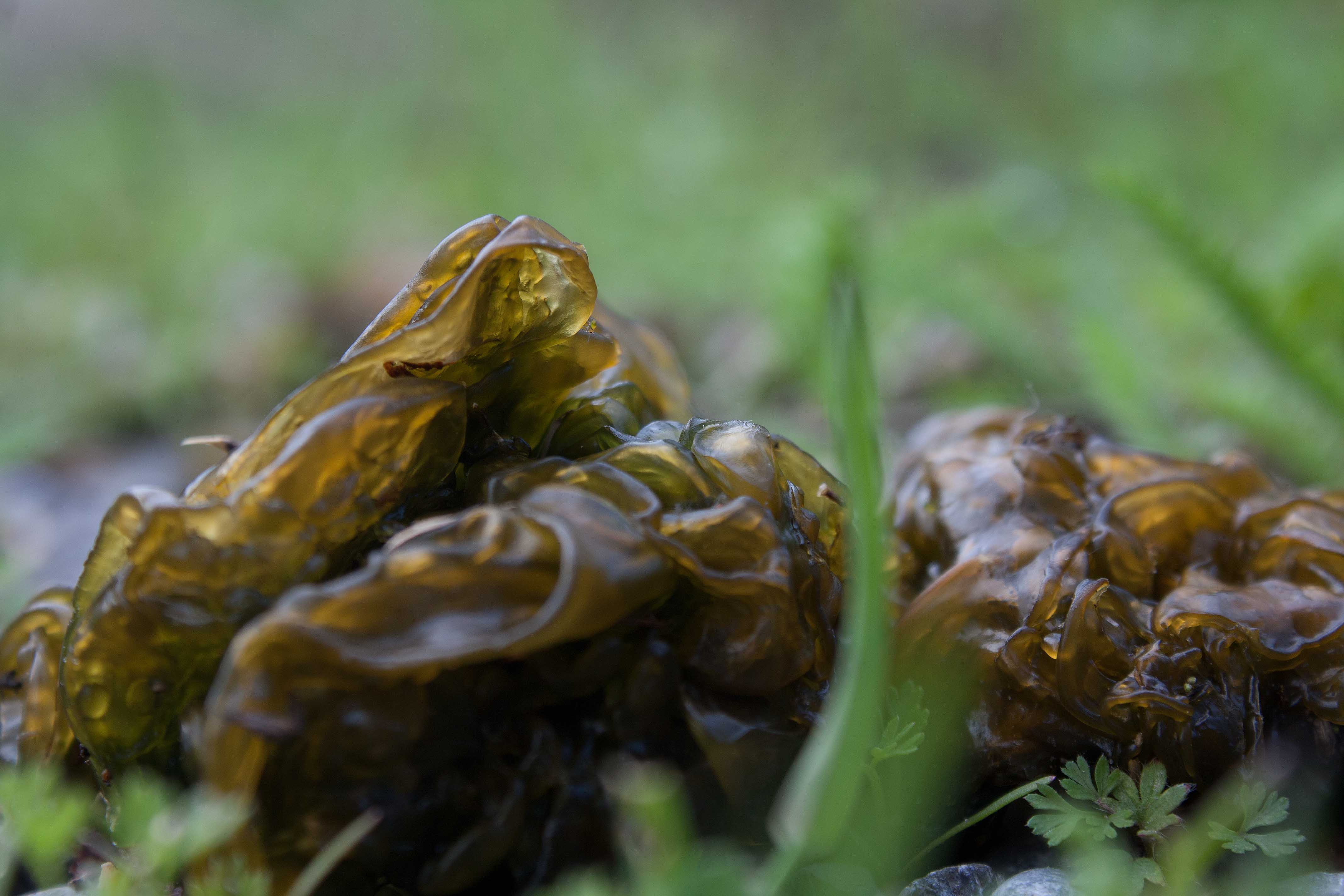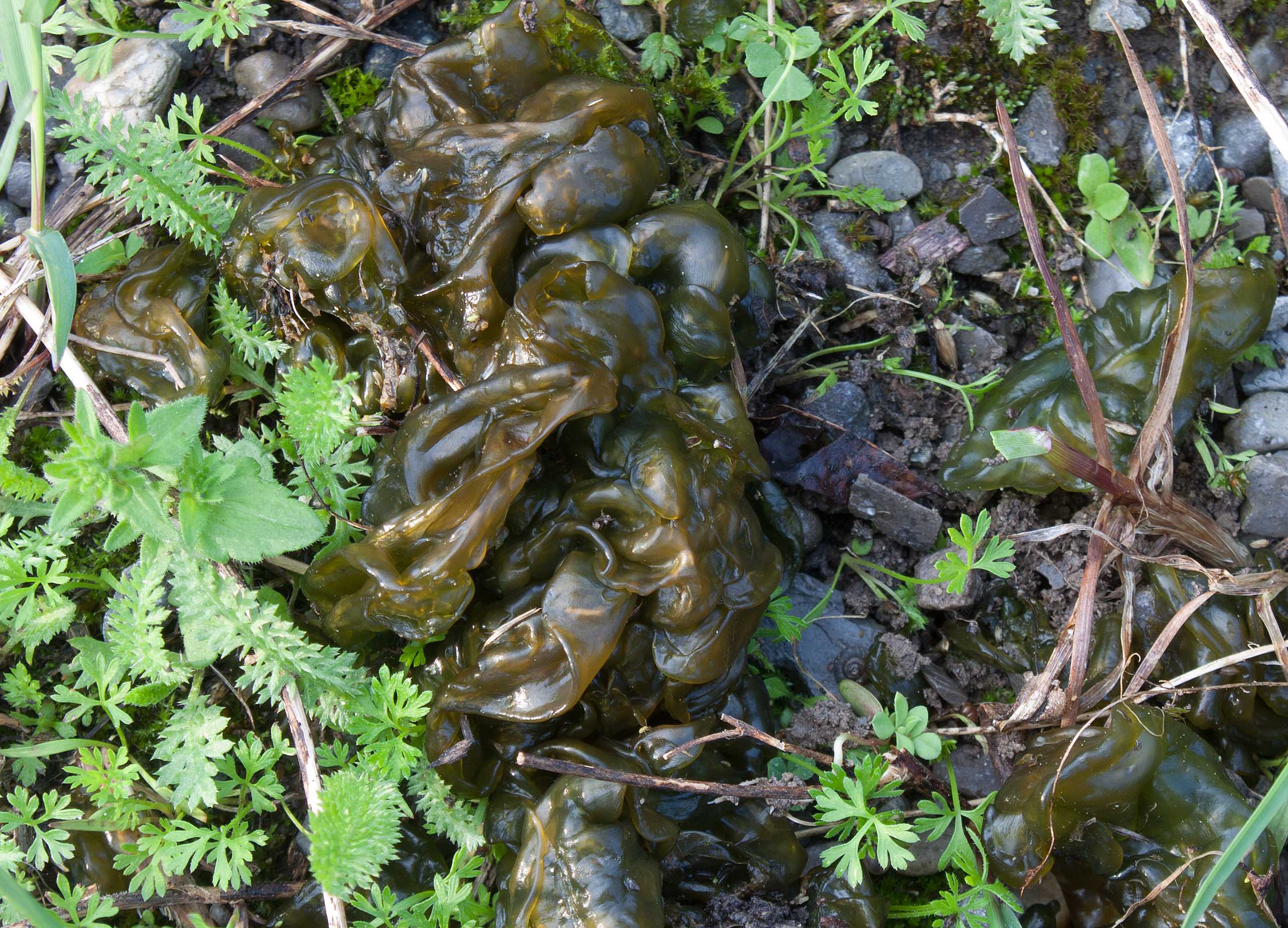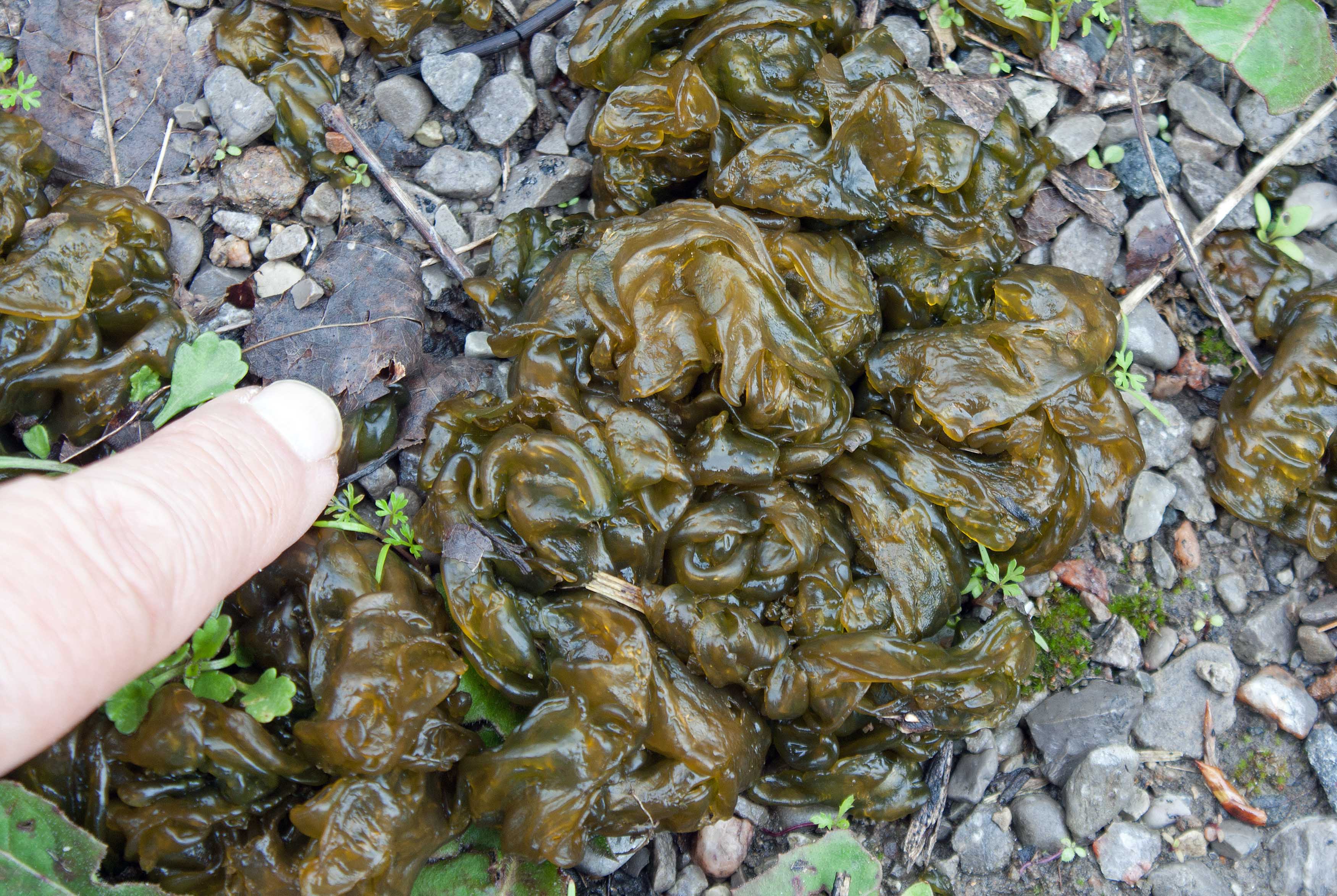 Close up of rubbery hydrated Nostoc commune on gravel road, ON (photo by Nina Munteanu)