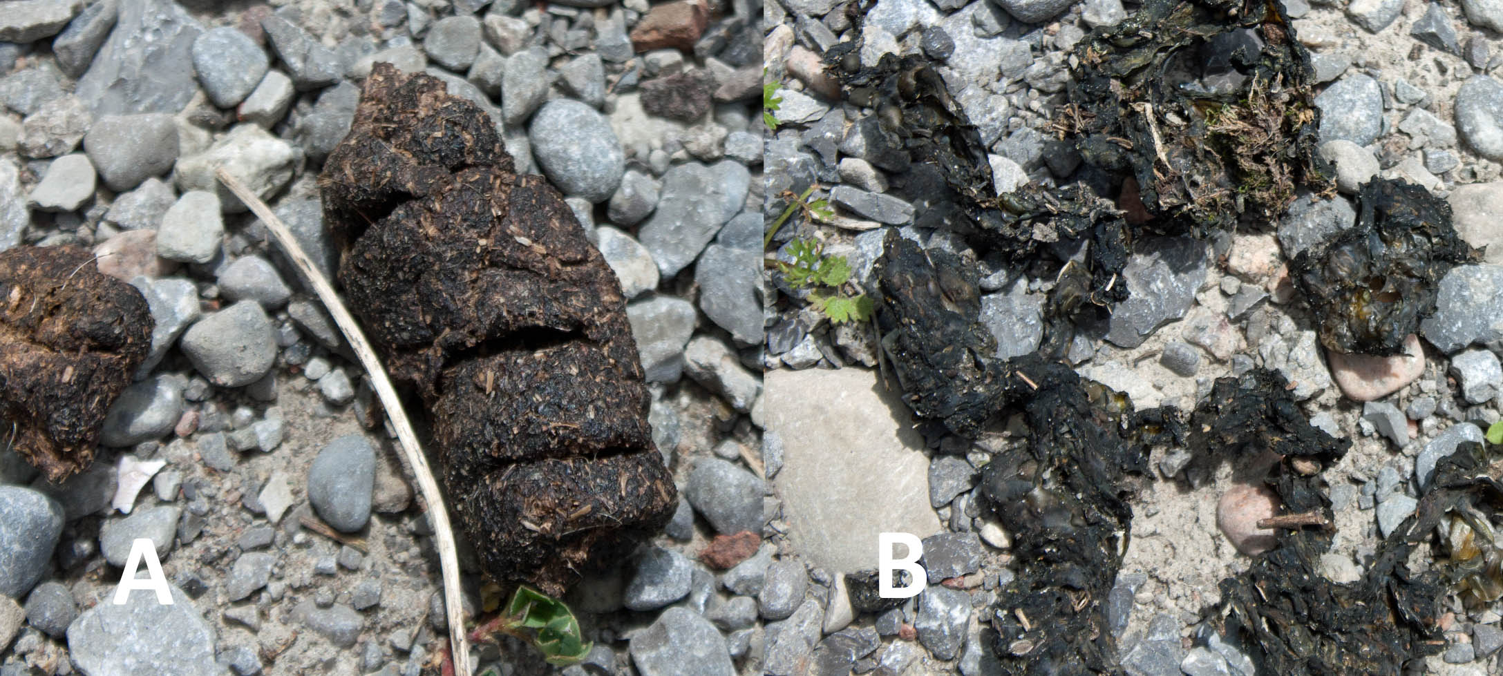 A. real dog poo that I found on the gravel path; B. dried Nostoc commune on the same path (photos by Nina Munteanu)