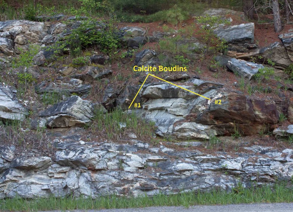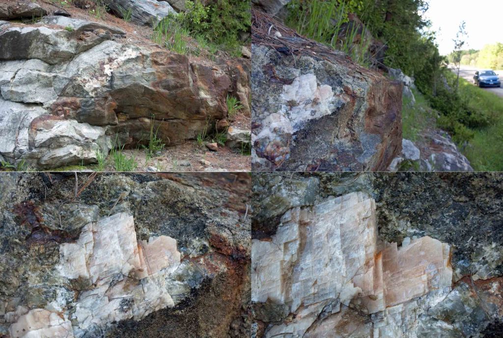 Inspired, I sought out the same site. I knew it was 3.6 km south of Gooderham in an eastside exposed formation of a road cut. The road cut was large, stretching some forty feet along the road, and I couldn’t locate the site from the poor-grade photo, which had been taken 25 years ago. Undeterred and looking for marble mylonites, I proceeded to clamber over boulders and ledges and clawed my way over the forty to fifty foot long road cut of highly sheared layers. I found several calcite lenses: one was creamy-coloured, whitish and lumpy or brecciated (#1 boudin); another was pink to orange and cleaved (#2 boudin). As I continued, black flies persistently buzzed and bit viciously around my head and neck. I tried to ignore them and continued my search.