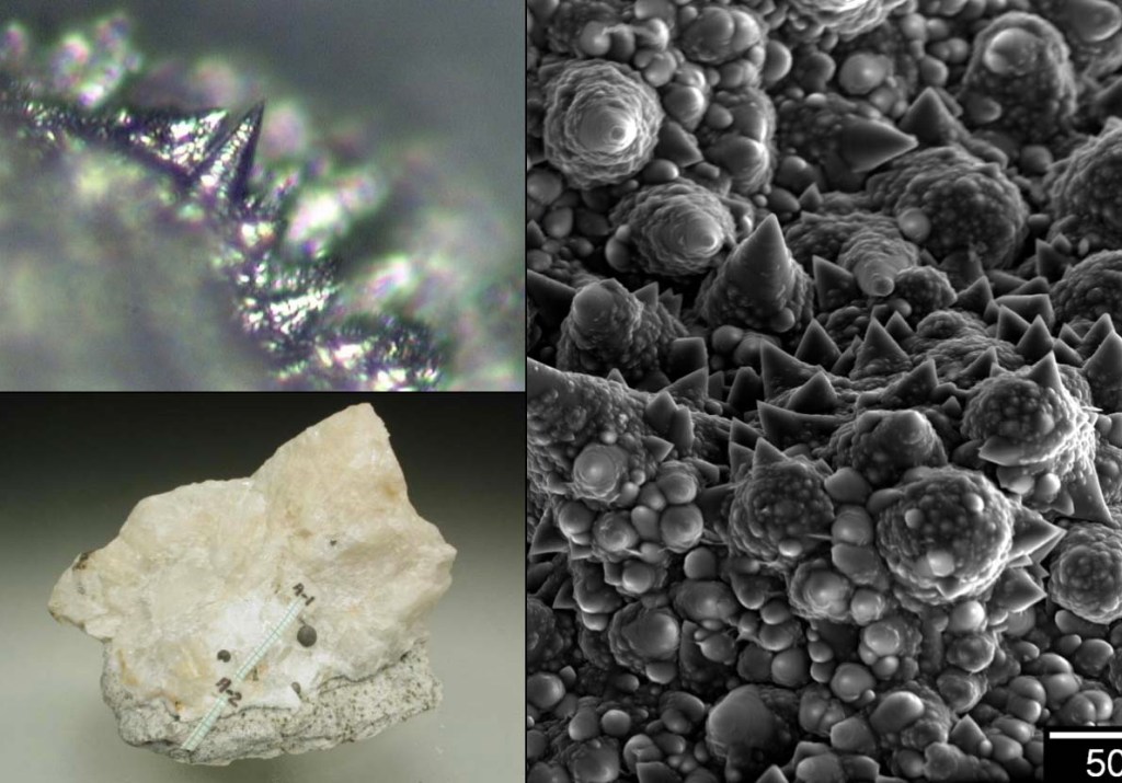 In a stretch from 3 to 5 km south of Gooderham (along the Bancroft shear zone) and in particular an eastern road cut 3.6 km south of Gooderham, scientists from Michigan Technological University identified spherical, spheroidal and ‘triskelial’ aggregates of graphite (0.1 to 10 mm in diameter) embedded in calcite veins (boudins) up to 30 cm across. Their microscopic study showed that the graphite cones range in size from sub-micrometer to 40 microns tall, have a variety of apex angles, and can be sharp or rounded.