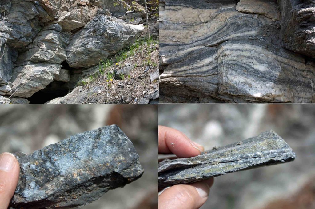 What made these marble mylonites even more interesting than they already were was the discovery of graphite spheres embedded in them. In 1999, Jaszczak and colleagues described a particular boudin find and showed a photo of a scientist sitting beside a boudin that contained: “calcite bearing spherical graphite with adjoining gneissic, schistose, and marble layers. This is the same boudin shown to the right of the scientist in the road cut.”
