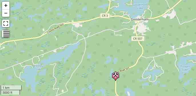 I don’t call myself a treasure hunter. But I am an explorer; I look for a ‘treasure’ of sorts, I suppose: the treasure of discovering something new. So on that day in May, I set out to explore new territory. I decided to drive north from Peterborough on Haliburton County road 507, as far as it went, which was the small hamlet of Gooderham in Highlands East. The village is essentially several houses and shops, a church, community centre and diner clustered around where Highway 507 meets H503 and ends. And where a prize awaited me…