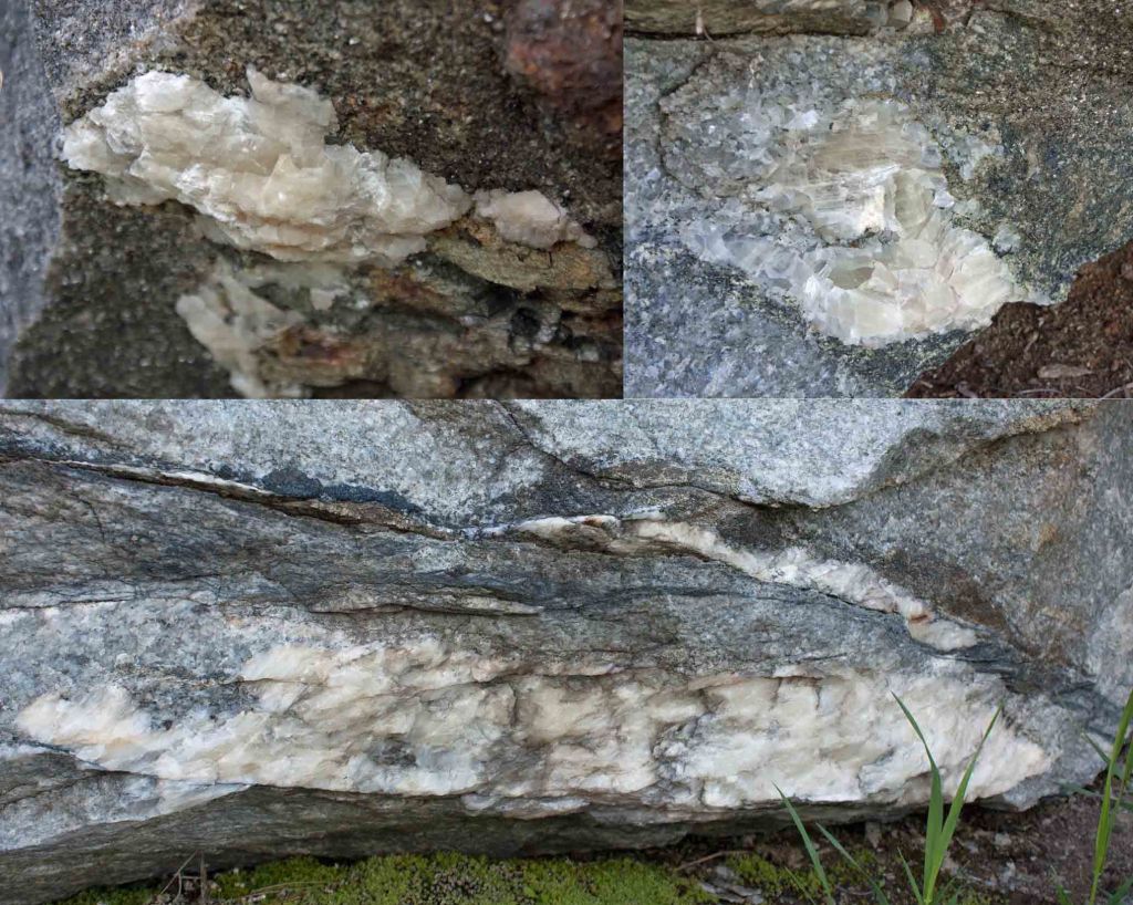 #1 boudin I determined was coarse crystalline calcite marble: a marble mylonite and feldspar/amphibole skarn with brecciation from shearing. The boudin was hiding under a ledge of a large overhanging boulder and contained what looked very much like an embedded graphite sphere about 2 mm in diameter.
