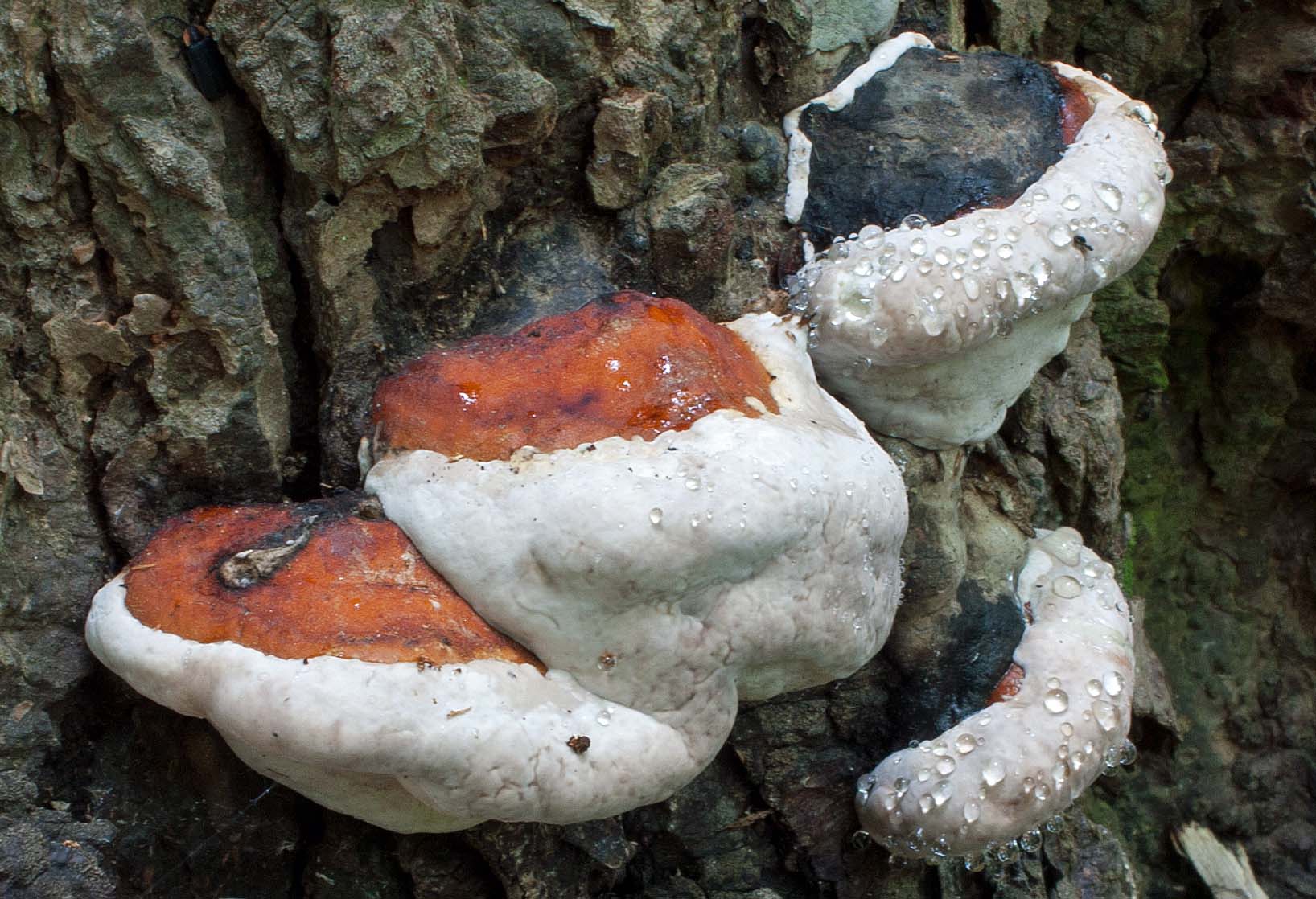 Further along my walk in the northwest lowland, I saw young specimens on a maple tree of the polypore Fomitopsis pinicola, showing signs of guttation. Guttation is a common phenomenon in the fungal kingdom that involves the active exudation of water and dissolved substances. It is often associated with stages of rapid growth in a fungus and thought that during rapid metabolism excess water produced by respiration is exuded. The exudate of water and secondary metabolites is likely a rich source of bioactive compounds that could include mycotoxins, antimicrobials, insecticides, bioherbicides, as well as antiviral and anticancer agents.