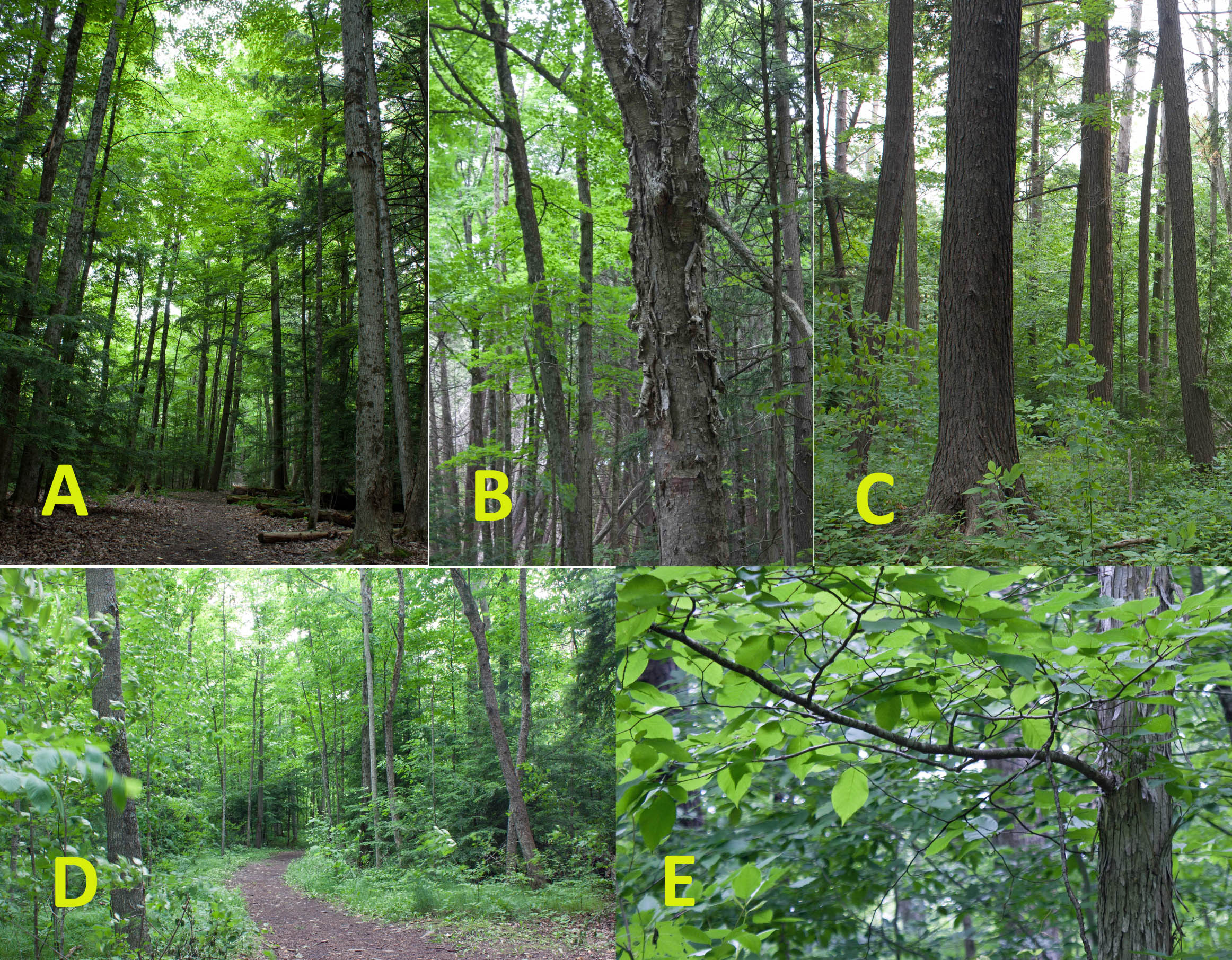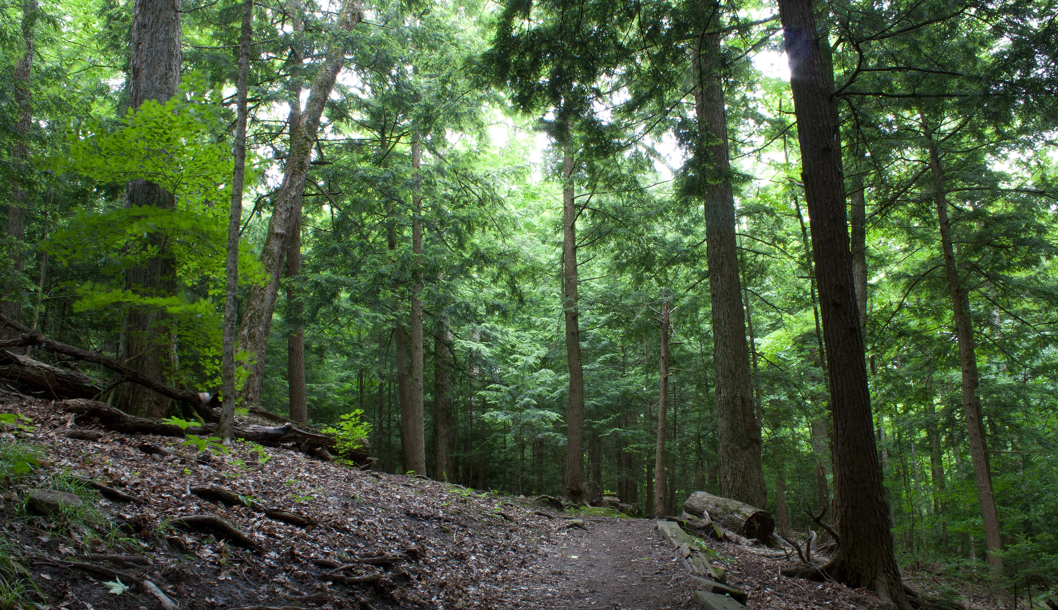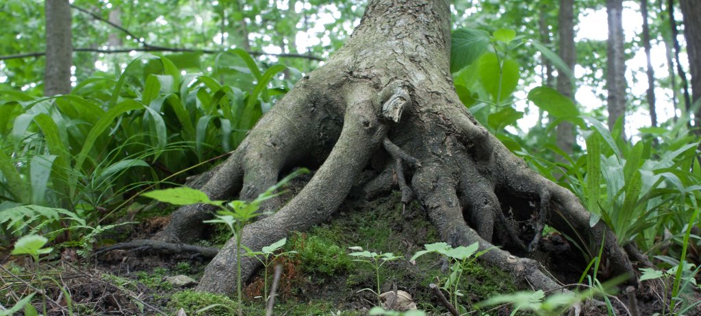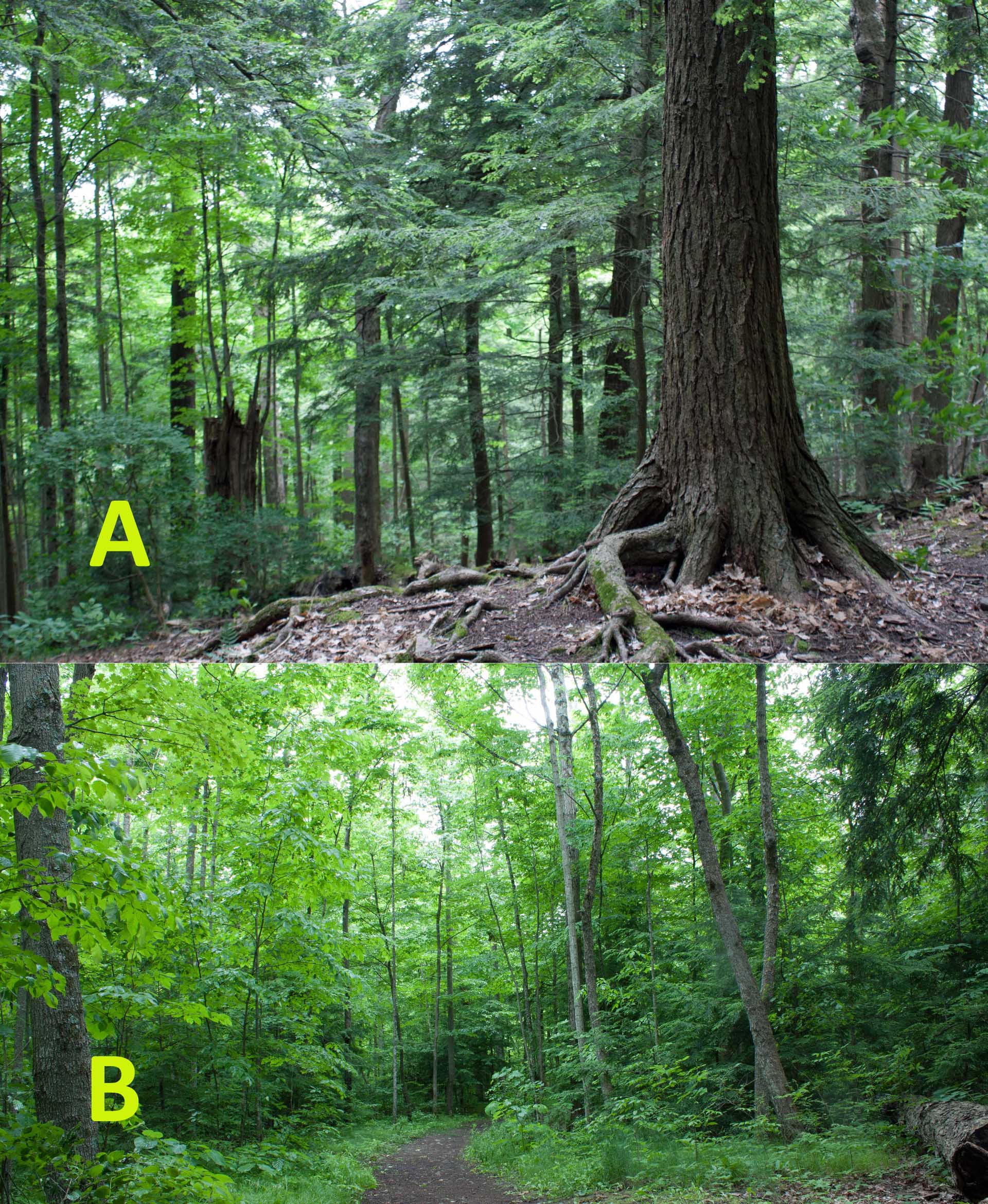 The drumlin hill of gravely rock debris pushed there by an ancient glacier, separated the forest into two different environments: the cooler damper northwest side supports large conifers like hemlock and cedar that shade the lower swamp forest and hillside and whose needles and debris make the soil slightly acidic for shade-loving plants; the warmer and drier southeast side favours the growth of sugar maple, beech and ash with understory of hophornbeam and basswood, which allow filtered sunlight through the forest. When they shed their leaves in the fall, the leaves break down into rich soil, supporting many plants.