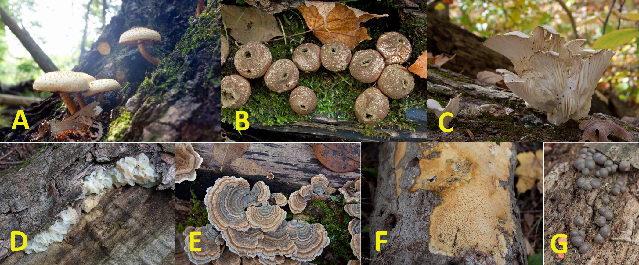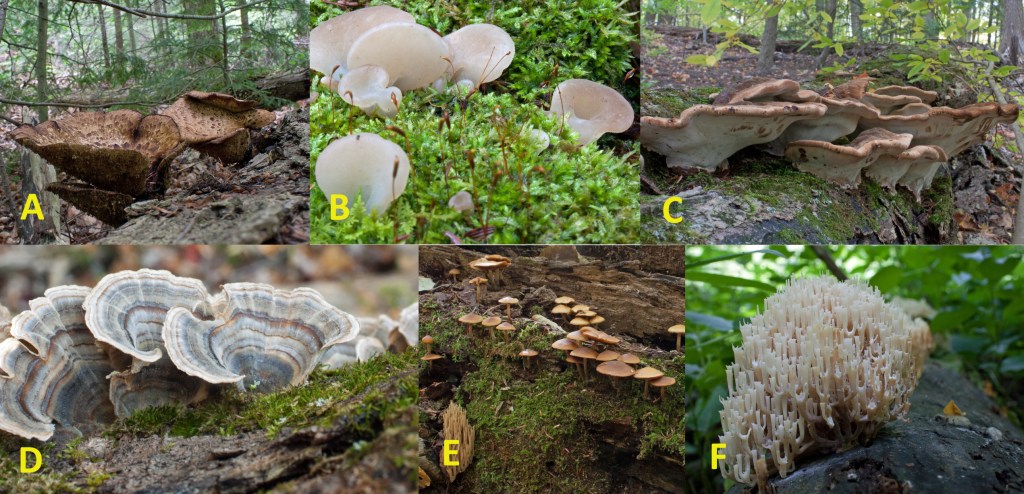 These same rich soils along with nursing logs and snags provided perfect substrates for colonizing fungi. This included scaly pholiota (Pholiota squarrosa) at the base of a maple, and the slime mold Wolf’s Milk (Lycogala epidendrum) gorging on a rotting beech log, several coral fungi (e.g. Phaeclavulina abietina), and frilly Turkey Tail (Tremetis versicolor) everywhere. The white oyster mushroom (Pleurotus ostreatus), found on a dead maple, makes a lovely dish according to Jenny at Mushroom Appreciation. I also saw more deadman’s fingers on a rotting maple log.