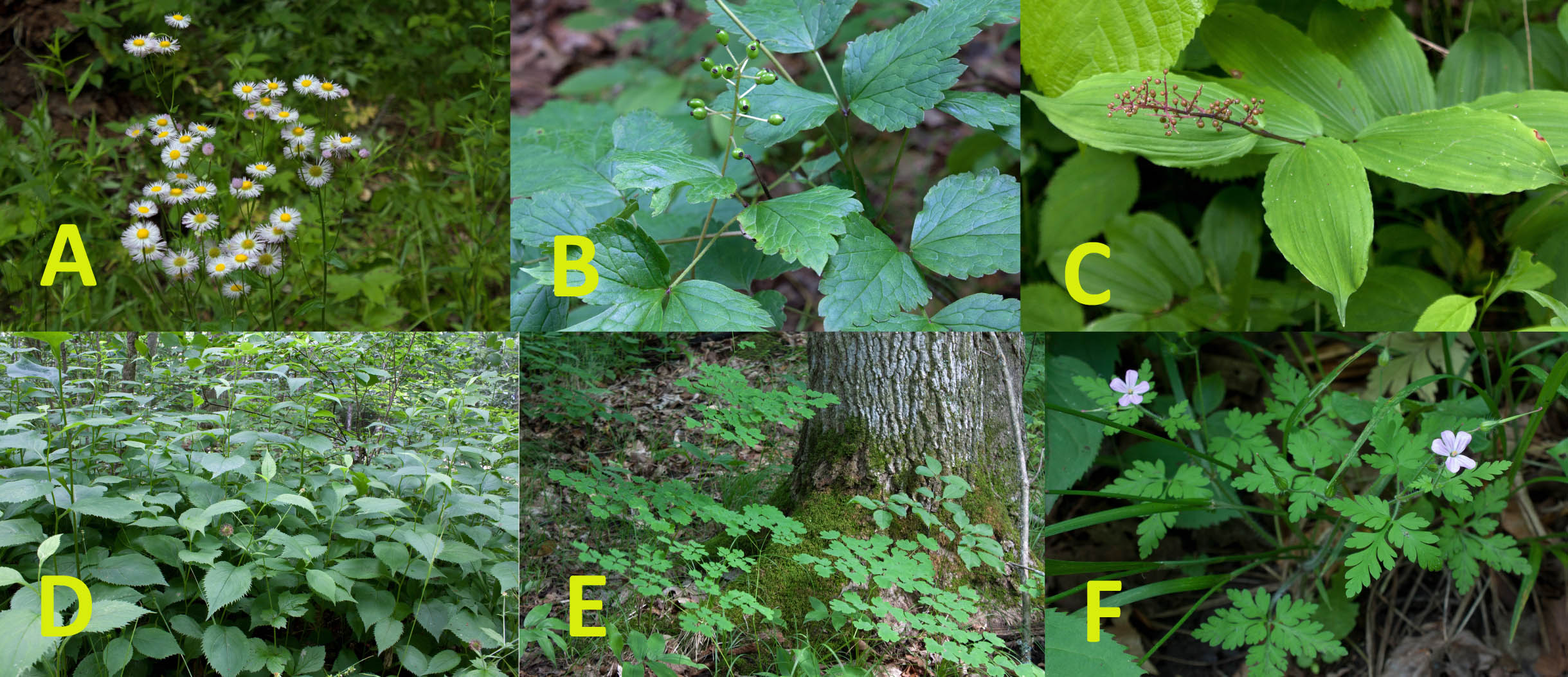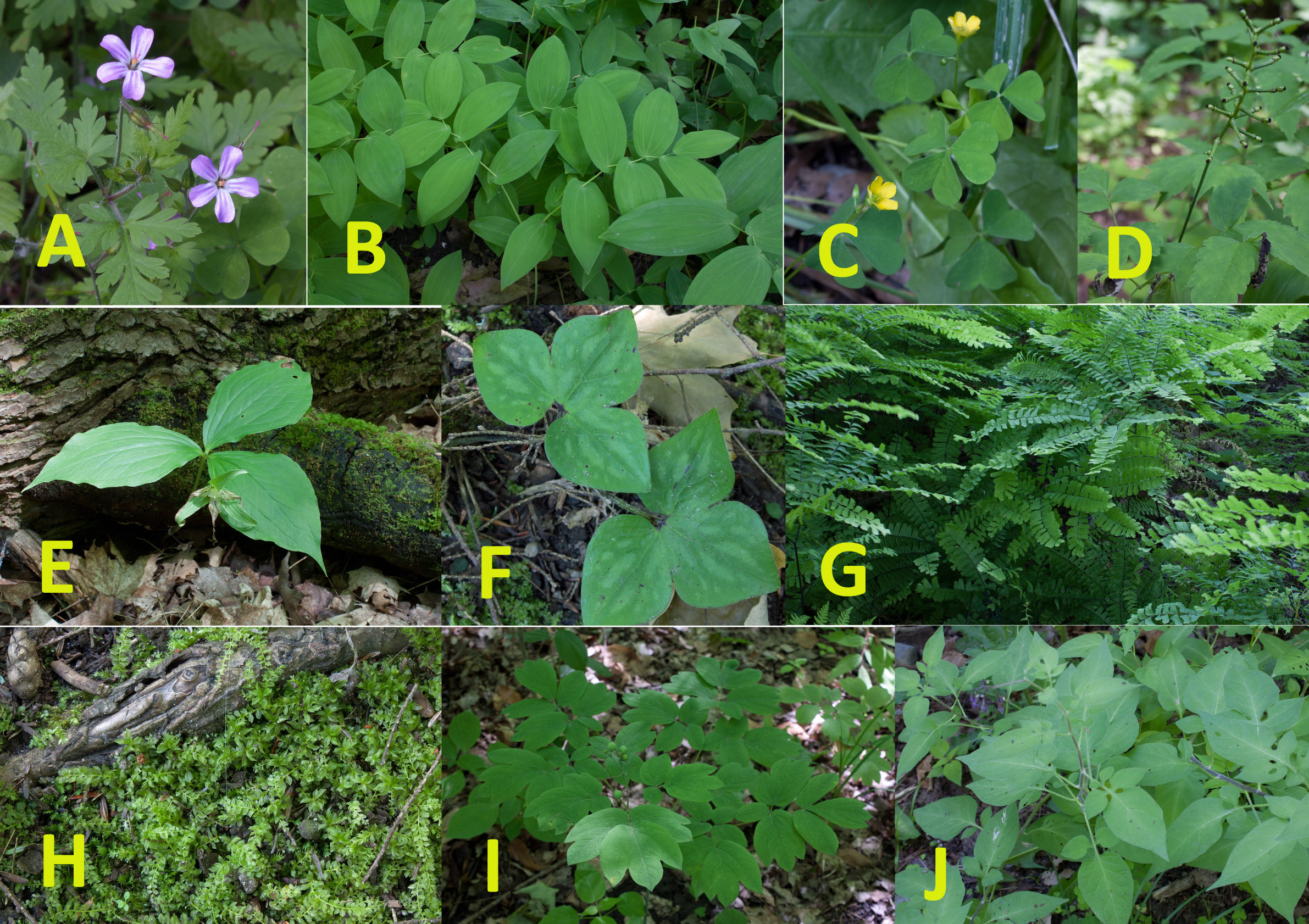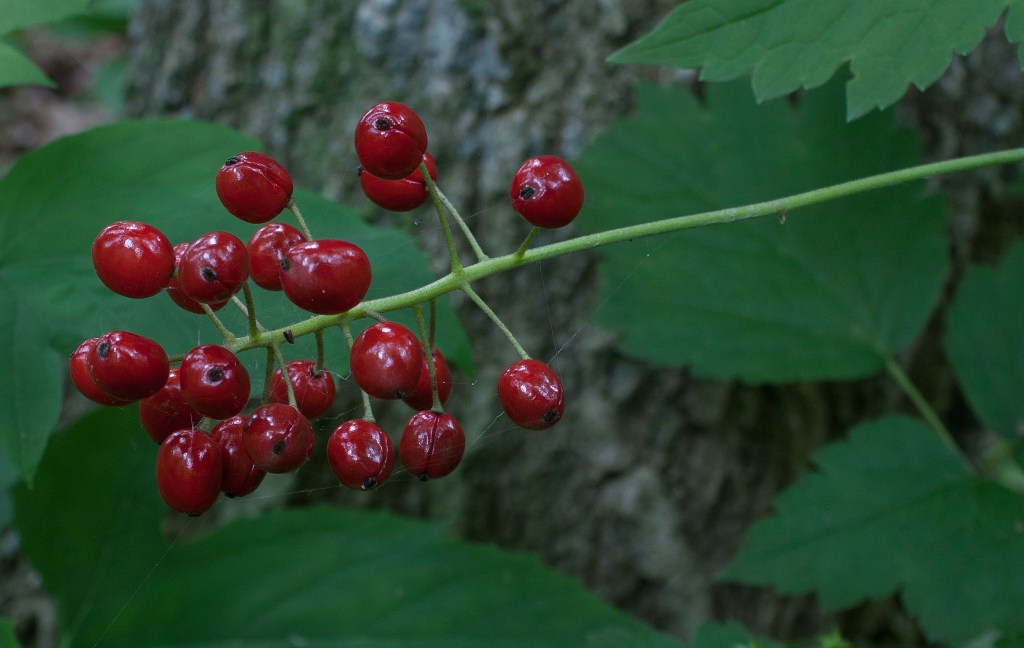 There was also the somewhat poisonous bittersweet nightshade (Solanum dulcamara), bloodroot (Sanguinaria canadensis), sharp lobed hepatica (Hepatica acutiloba) amid the mosses, red trillium (Trillium erectum), false solomon’s seal called solomon’s plume (Maianthemum racemosum), twisted stalk (Streptopus amplexifolius), zigzag goldenrod (Solidago flexicaulis), herb Robert (Geranium robertianum), and wood sorrel (Oxalis stricta). I saw both red baneberry (Actea rubra) and white baneberry (Actea pachypoda) throughout the forested park. Both are also quite poisonous (particularly their stunning berries). In early summer their berries were not yet ripened; but within a few weeks the red baneberries soon ripened into their juicy crimson colour. The white baneberries are soon to follow.