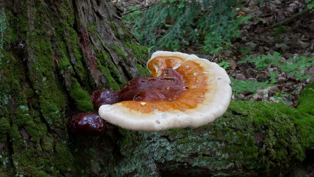 Deep in the hemlock forest, I was alerted to the bright red shine of a Hemlock Varnish Shelf (Ganoderma tsugae) colonizing the base of a dead hemlock tree. The red ‘varnish’ of the large polypore stood out against the moss-covered bark of the maple tree. Barbara Batakova of FungiWoman tells us that while the hemlock varnish shelf (also called hemlock reishi) is not the true reishi (G. lucidum is), “the two species are closely related and resemble each other but have very different habitats. G. lucidum only grows in wild in China and parts of Europe on hardwoods, while G. tsugae only grows in the wild in the North America east and on eastern hemlocks.” However, Batakova also notes that like a true reishi with its long history of use for promoting health and longevity in China, Japan, and other Asian countries, the hemlock reishi is also believed to have medicinal properties contained in protein-bound polysaccharides within the mushroom.