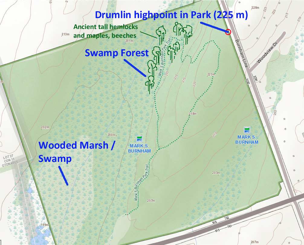 The Mark S. Burnham forest is bisected by a long northeast-southwest running hill or drumlin. The term “drumlin” comes from the Celtic word for “little hill;” these small rounded hills were created by flowing glacial rivers of ice and dirt. As they moved across Ontario more than 10,000 years ago, they carried massive amounts of debris (dirt, gravel, rocks, and boulders). Drumlins like the one in this park are basically piles of dirt and gravel that were dumped as the glaciers moved on. This drumlin’s peak elevation is 228 m. Its highest point within the park lies on the northeast corner of the park at 225 m elevation.