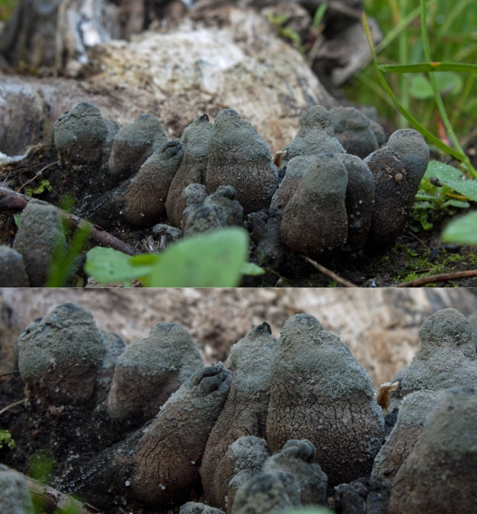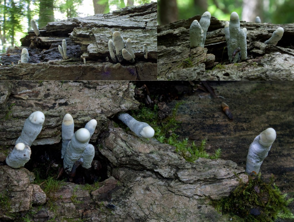 On one large rotting maple log near the top of the drumlin, numerous saprotrophic ‘fingers’ of Xylaria polymorpha—aptly called Deadman’s Fingers—emerged through the cracks in the rotting bark. These were young fingers in their conidial (asexual) spore-producing stage: about 2-3 cm high (they can reach 8 cm when mature), they appeared blue-grey necrotic-looking with white tips that resembled ‘finger nails.’ Some fingers were actually guttating, clear drops forming on the ‘finger tips.’ In spring/early summer the young fingers are covered in a fine grey dust (conidia) or asexual spores. As the fruiting body (called a stroma) matures, the conidia flake off, the fruiting body turns bumpy and dark brown to almost black. The stroma’s surface is covered with tiny pores (the mouth/exit of individual fruit bodies called perithecia), best seen when it is more mature and darker. A while ago, when I broke apart a mature Xylaria colonizing a dead beech tree, the inside was white with black bubbles; these produce the sexual spores (ascospores) that are released from the fingers over several months or years. This saprotrophic fungus grows on dead woods of various hardwood trees, preferably beech, where I had found it before. But this time it was a maple tree. Xylaria polymorpha is a wood-rotting fungus that consumes the polysaccharides such as glucan that bind the cellulose and lignin to form wood. What remains is a nutrient-rich soft mess that insects and other creatures feed on.