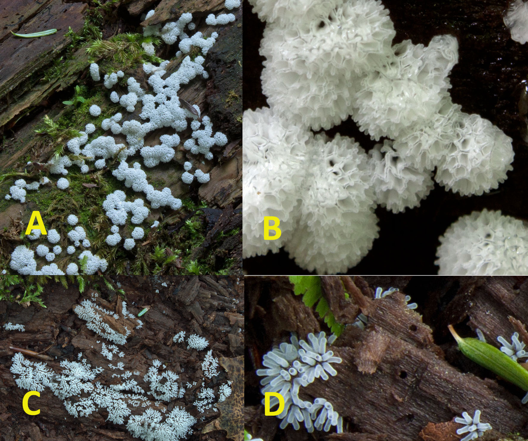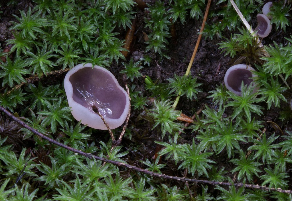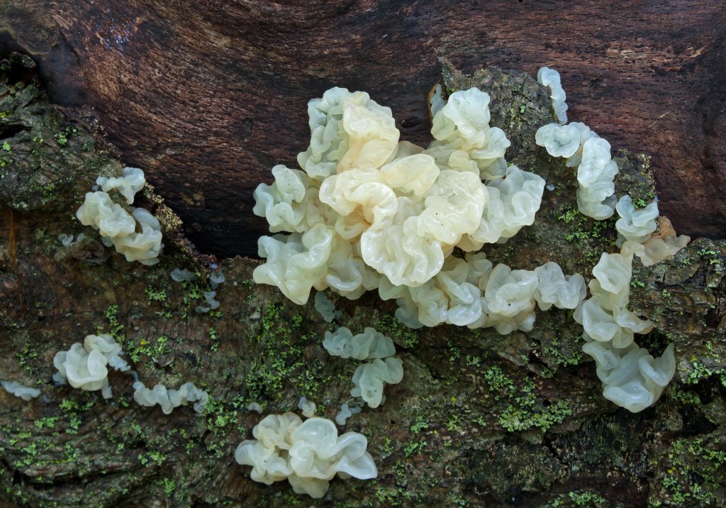Days after, on another walk following a good rainfall, I spotted a proliferating colony of violet fairy cups (Peziza violacea) growing in moss, probably Polytrichum. And just steps farther, on a decaying maple, I spotted a brain-looking white jelly fungus, Ductifera pululahuana. The fungi were all out that day!