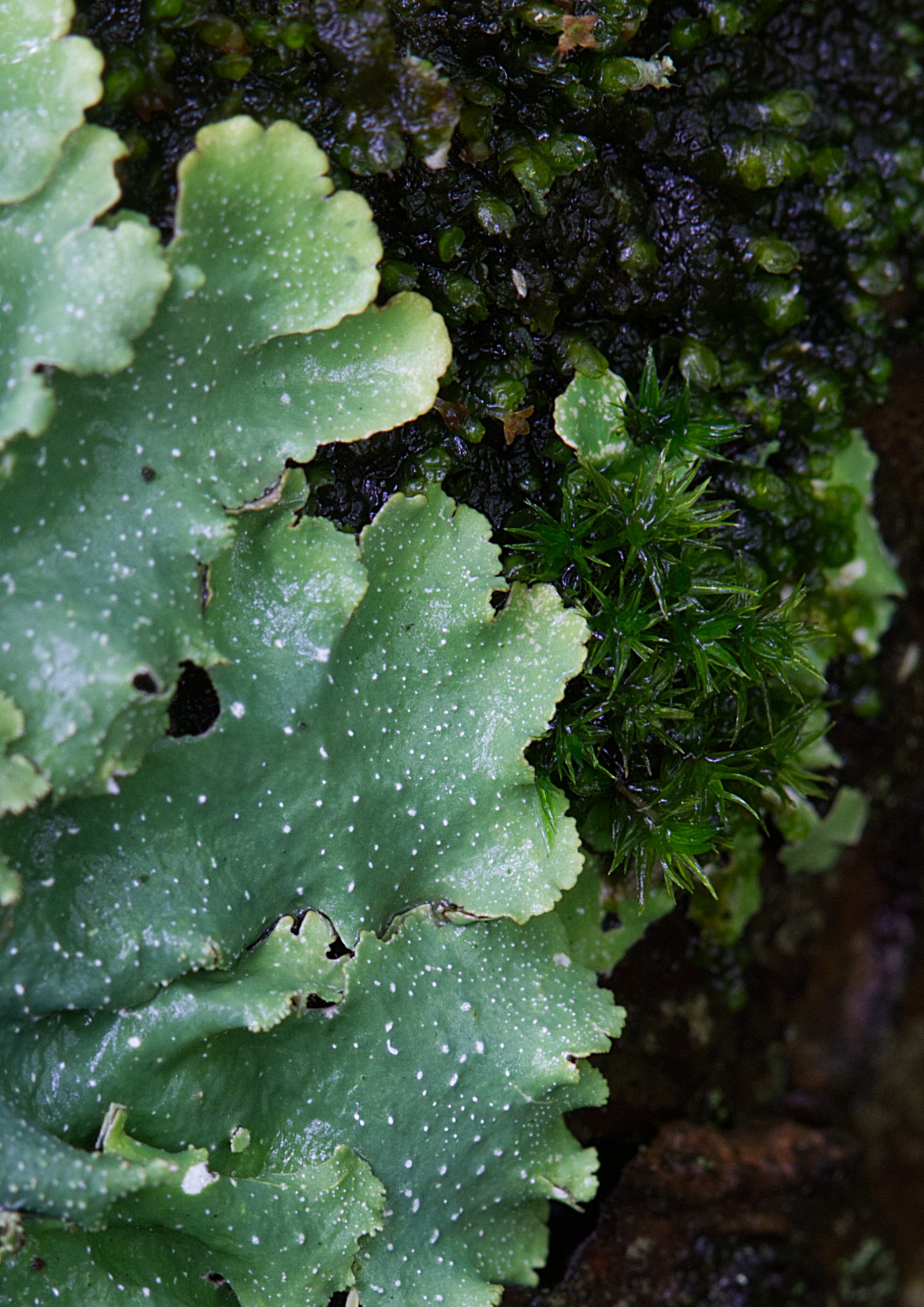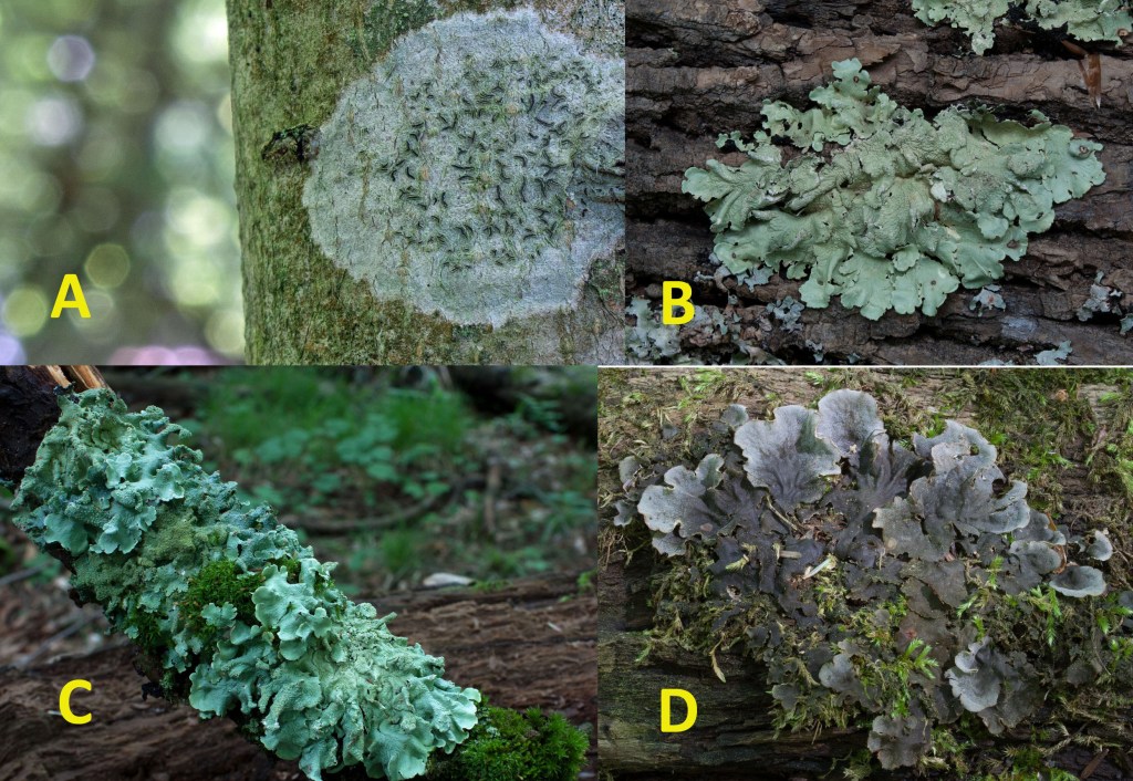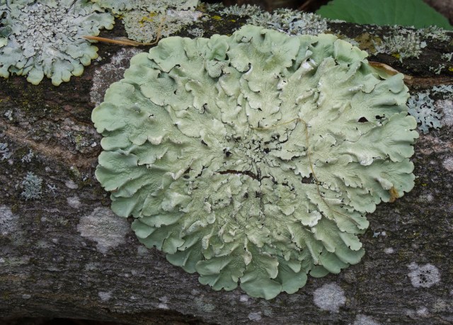 On a decaying cedar log of the dark hemlock forest, I observed the foliose many-fruited pelt lichen, one of many species of lichen supported by this rich forest. I also found several beech trees covered in script lichen (Graphis scripta). This crustose powdery lichen gets its name from the darkish squiggling ‘heiroglyphics’–as though some hidden coded message–that are the apothecia of the lichen. The script lichen shows its intelligence by preferring the smooth bark of a beech tree on which to ‘write.’ I also found on fallen branches several shield lichens such as Common Greenshield (Flavoparmelia caperata) and Rough Speckled Shield Lichen (Punctelia rudecta) with its distinct white pores (pseudocyphellae) and isidia.