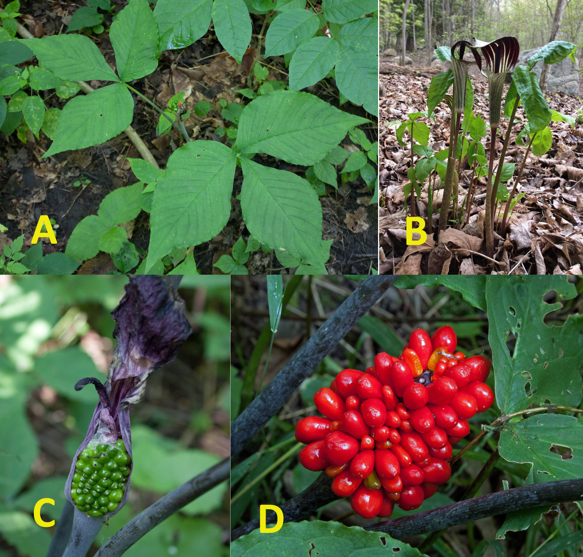 Jack in the pulpit (Arisaema triphyllum), with its three distinct leaves, was also common throughout the forest. It had just finished blooming and I saw clustered green berries that would turn bright red later in the fall.