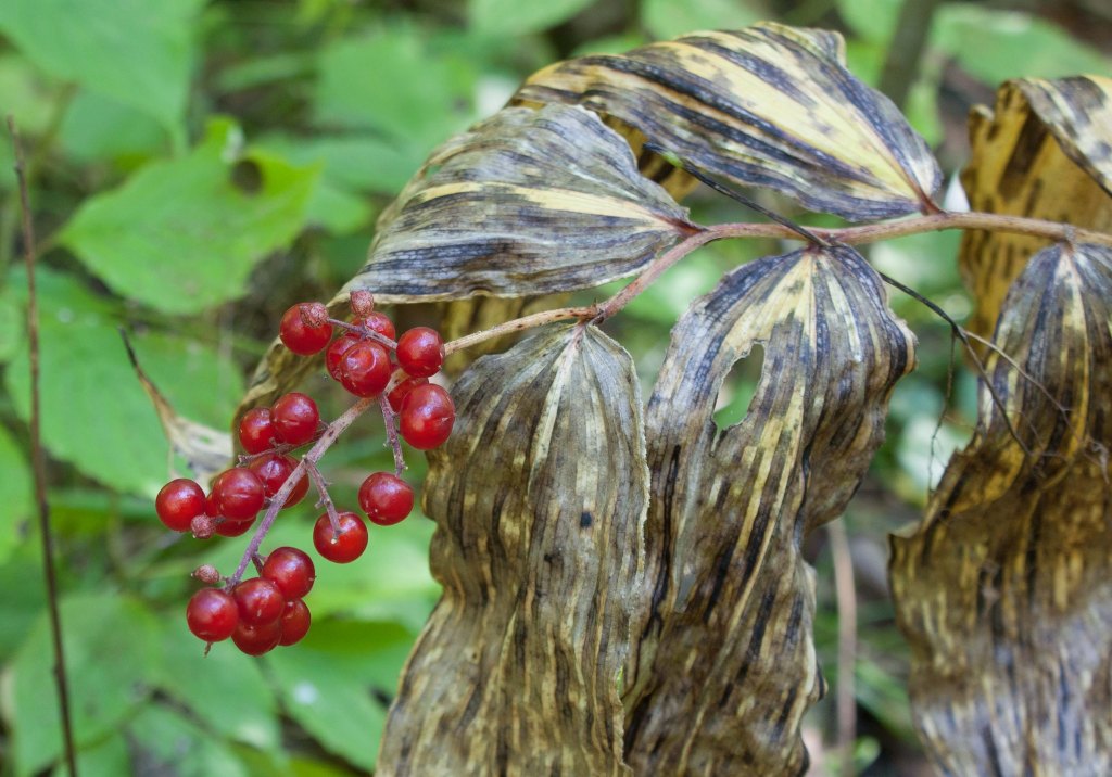 I saw false solomon’s seal or, as I know it, Solomon’s plume (Maianthemum racemosum). I also saw white baneberry (Actea pachypoda), which likes semi-shaded areas with rich moist soils.