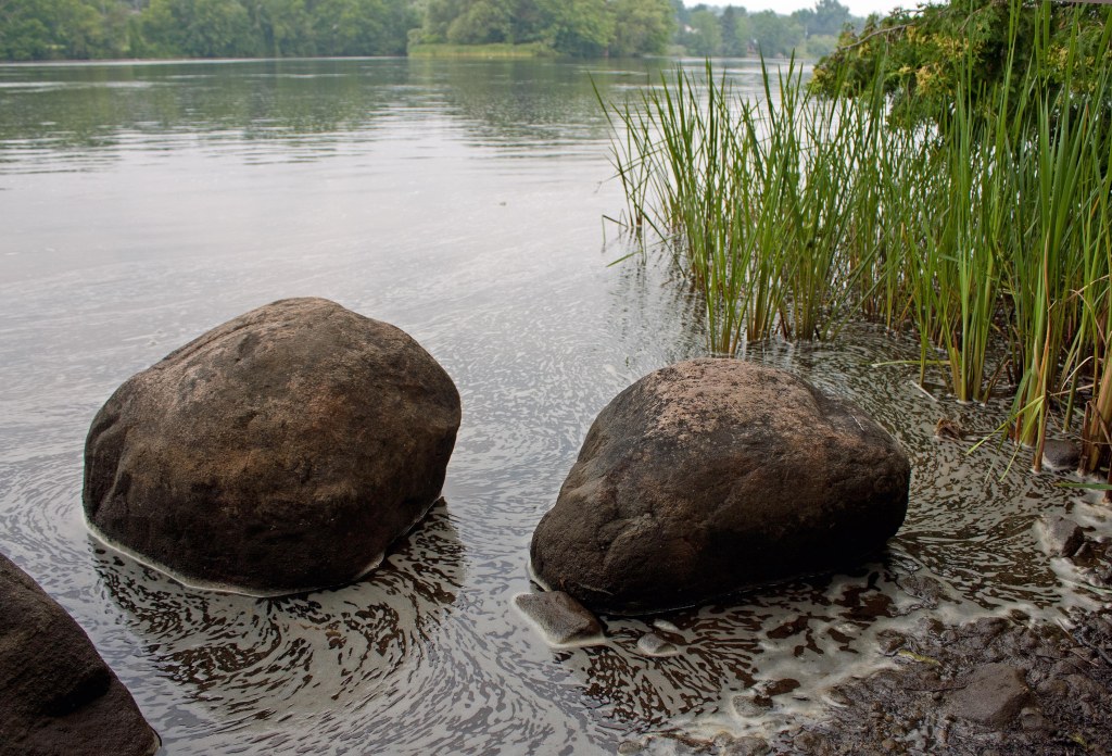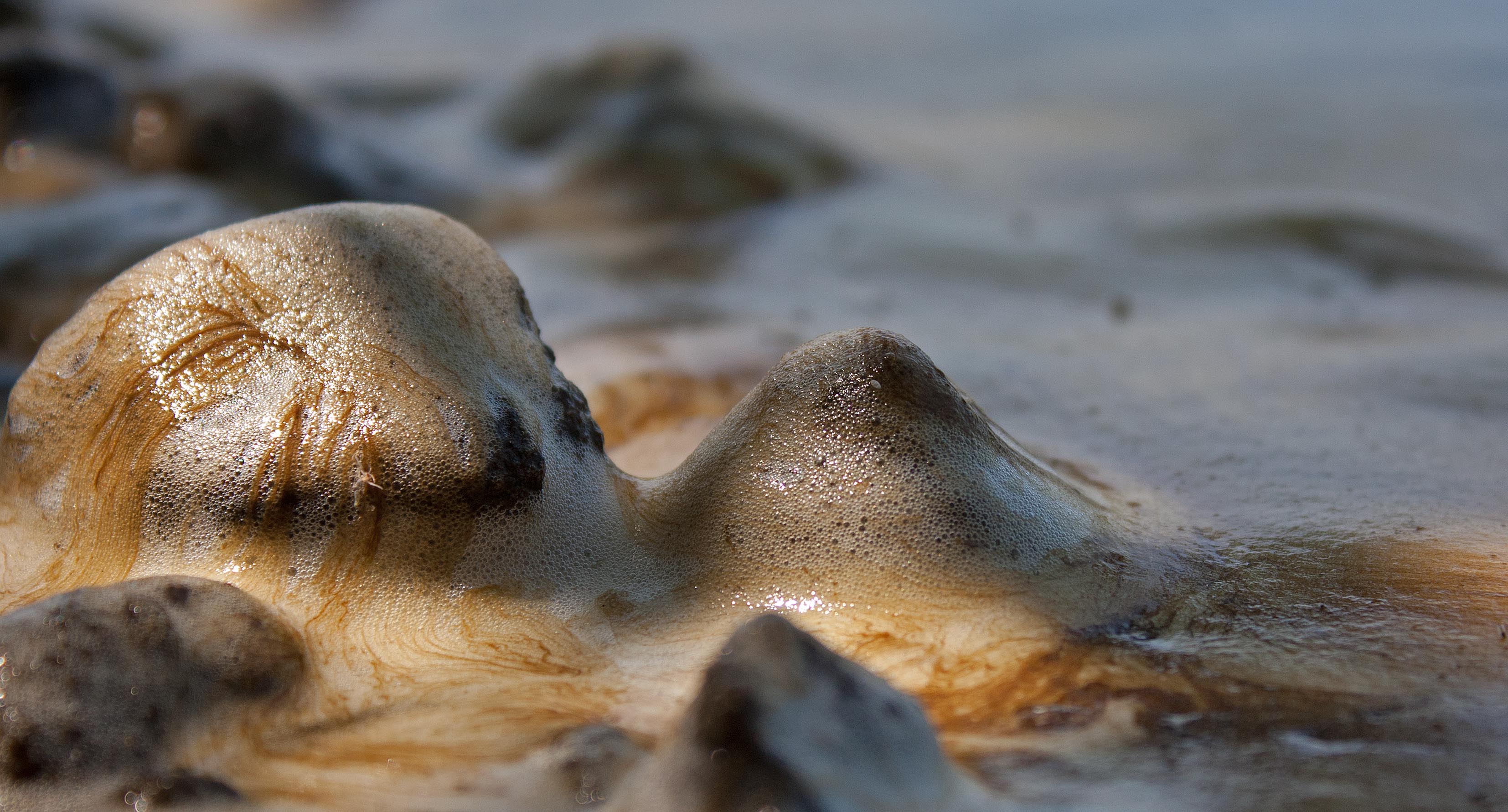 Eventually, ‘overgrowth’ occurs as the periphyton colony matures and grows ‘top-heavy’ with all this networking. The upper story of the community simply sloughs off—usually triggered by turbulence in a river from rains, storms, or dam release. This is similar to a forest fire in the Boreal forest, which creates space and light for new colonization and growth. The dislodged periphyton ride the turbulent flow, temporarily becoming plankton, and those that survive the crashing waters provide “seed” to colonize substrates downstream. Others may get damaged and form the ‘dish soap’ like suds or foam you often see in turbulent water. The proteins, lignins and lipids of the diatoms (and other associated algae) act as surfactants or foaming agents that trap air and form bubbles that stick to each other through surface tension.
