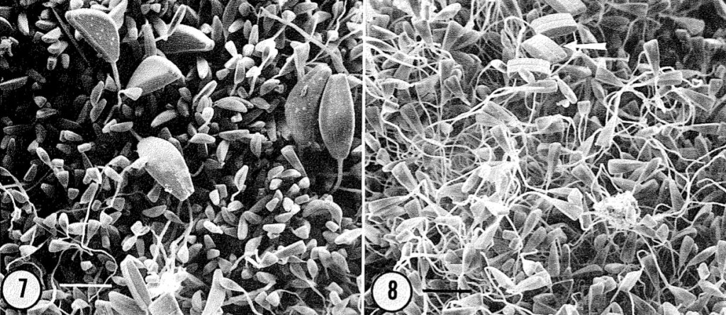 The stalked diatom forest acts like a net, trapping drifting-in euplankton, such as Pediastrum sp. andFragilaria spp., which then decide to stay and settle in with the periphyton community. The mucilage captures and binds detrital particles in both lower and upper stories of the diatom forest; these, in turn, provide nutrients for the diatom forest and additional surfaces for colonization. In their work with periphyton communities, Roemer et al. (1984) found several diatoms (e.g. Diatoma vulgare, Fragilaria spp. Stephanodiscus minutula) entangled in the complex network of cells, stalks, and detritus of the diatom forest’s upper story. They also found rosettes of Synedra radians—like jungle orchids—attached to large clumps of sediment caught by the net of mucilage.