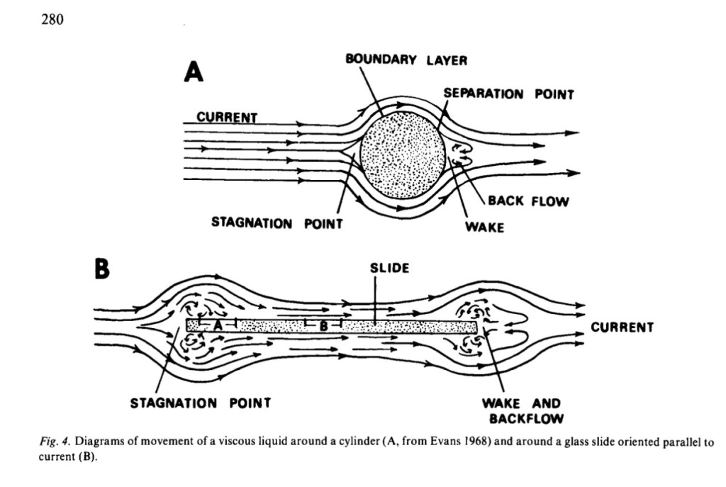 I discovered that the diatoms colonized these surfaces in weird ways based on micro-turbulence. Early colonizers, like Achnanthes and adnate Cocconeis preferred to settle on the edges of the slides, where the chaos of turbulence ruled over the sheer of laminar flow. They colonized by directly appressing to the substrate, making them the first photosynthetic taxa to establish a biofilm on a clean substrate. Vadeboncoeur and Katona (2022) write that “in waved-washed surfaces, these taxa may be the only algae that persist.” I postulated that the drift velocity was reduced on the slide’s edge, where turbulence was greatest, giving drifting algae a greater chance to collide and settle on the slide over the more shear laminar flow along the slide’s central face.