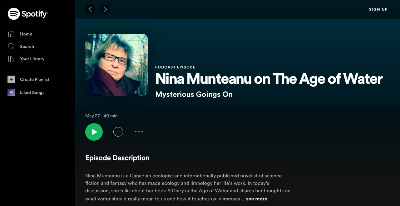 Nina Munteanu is a Canadian ecologist / limnologist and novelist. She is co-editor of Europa SF and currently teaches writing courses at George Brown College and the University of Toronto. Visit www.ninamunteanu.ca for the latest on her books. Nina’s bilingual “La natura dell’acqua / The Way of Water” was published by Mincione Edizioni in Rome. Her non-fiction book “Water Is…” by Pixl Press (Vancouver) was selected by Margaret Atwood in the New York Times ‘Year in Reading’ and was chosen as the 2017 Summer Read by Water Canada. Her novel “A Diary in the Age of Water” was released by Inanna Publications (Toronto) in June 2020.