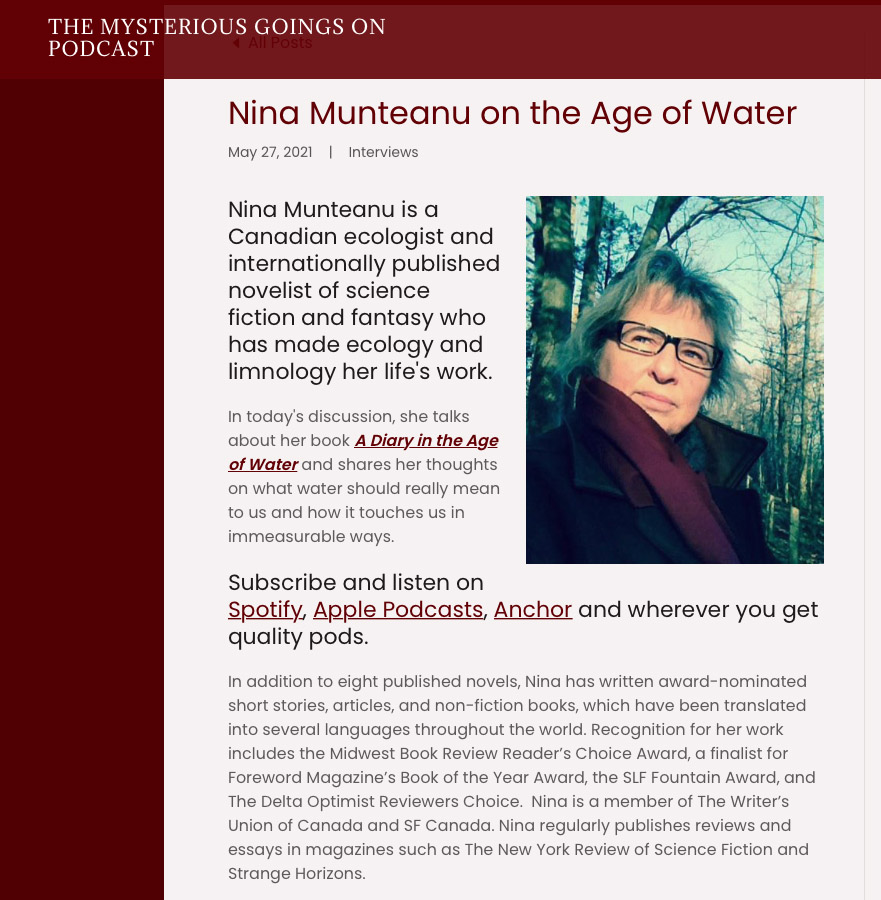 Alex Greenwood, host of The Mysterious Goings On Podcast recently interviewed me about my latest novel and work of climate fiction, the dystopia “A Diary in the Age of Water.”