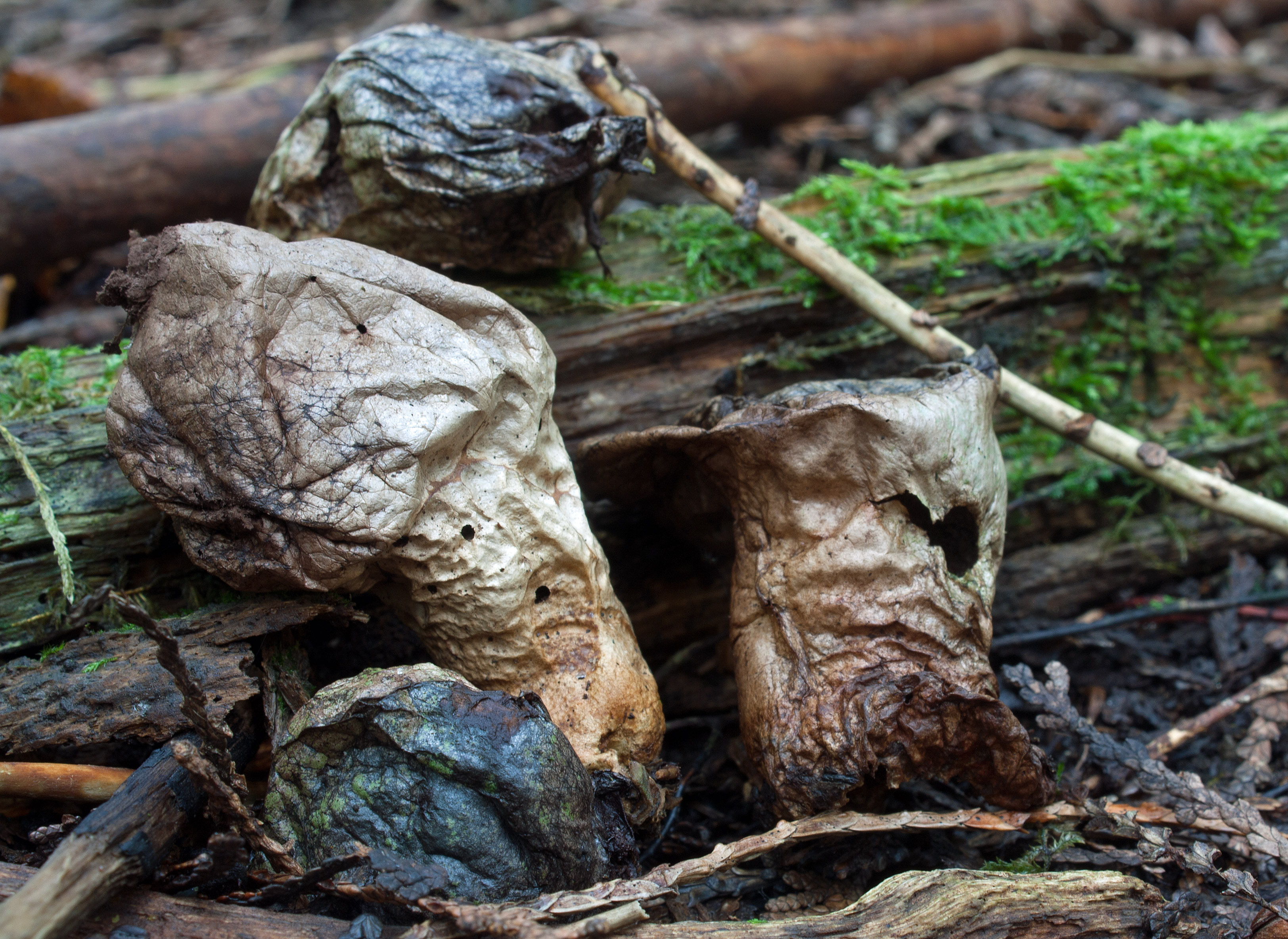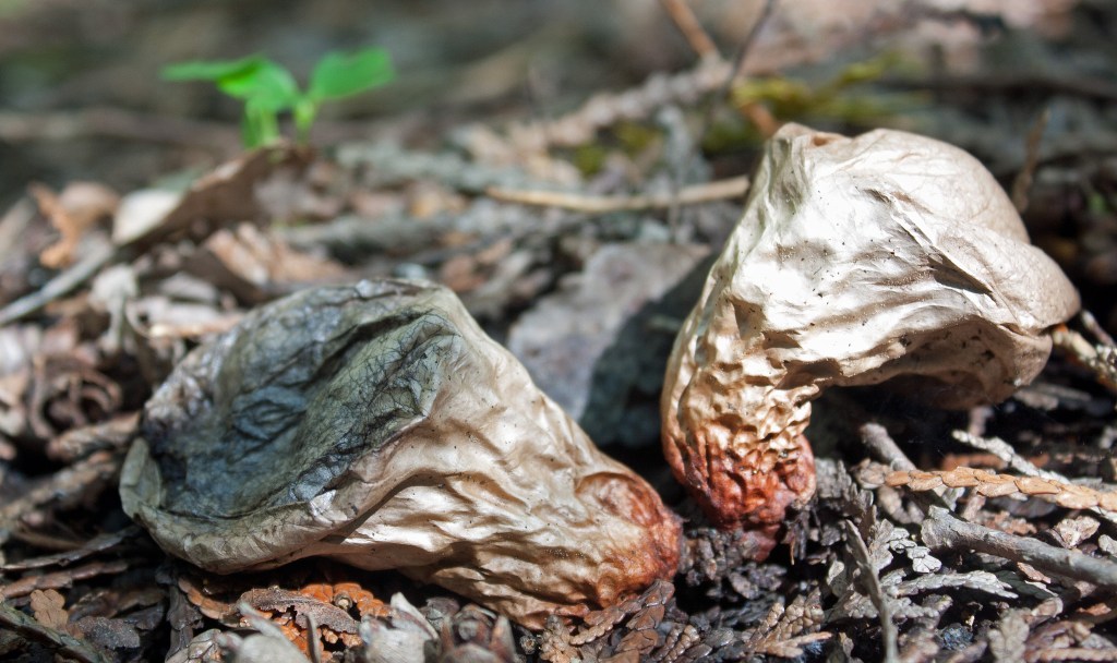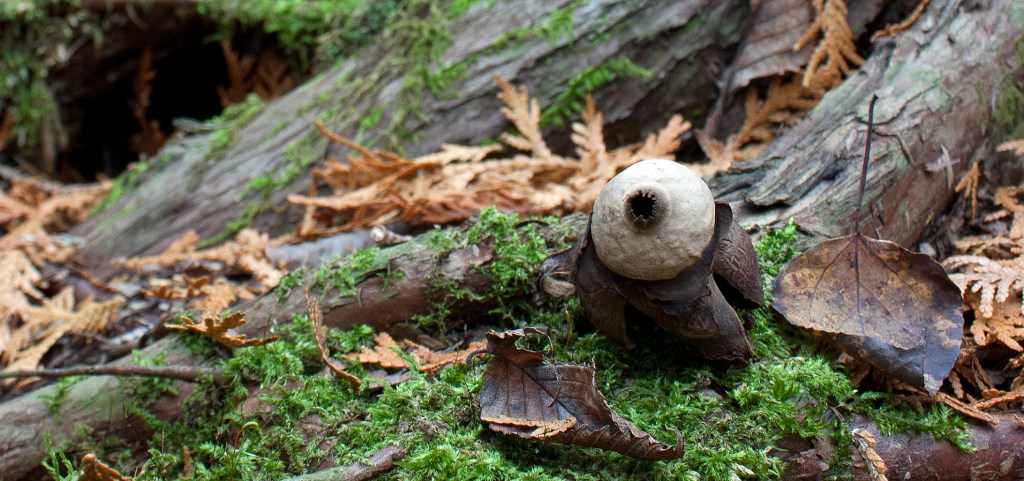 I saw every stage of Earthstar over the course of my visits: the early stage looks like a tear-drop shaped cocoa-dusted truffle, pushing itself out of the duff. The outer layer (exoperidium) cracks open and splits into several arms that spread out and down, lifting the spherical spore sac. The outer layer further splits around the perimeter of the spore sac to form a ‘collar’ around the base of the spore sac. These outer layers will later dry up into ochre-coloured patterned “rays” around the paper-like smooth spore sac (peridinium). The open pore (peristome) at the top of the peridinium is a small pointed beak that resembles a blue-grey fuzzy puckering mouth. When I poked one mature spore sac with an open pore, the ‘mouth’ released a blue-brown cloud of spores. Earthstars are used medicinally by indigenous peoples. The Blackfoot call them ka-ka-toos, meaning “fallen stars,” which—according to legend—are an indication of supernatural events.
