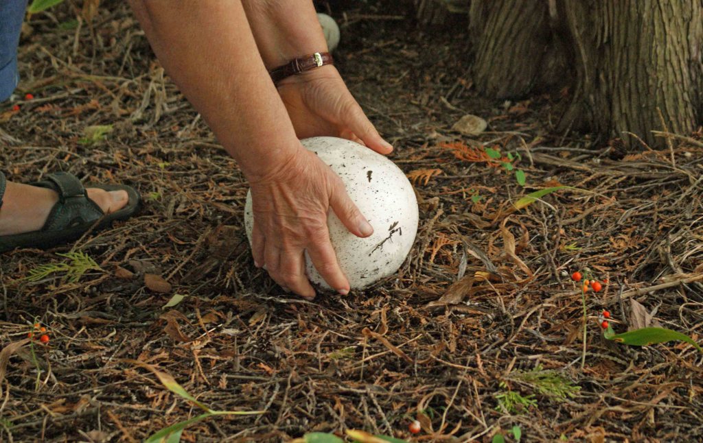 During a walk one day a small cedar grove in Peterborough, I chanced upon a large white globe resting in the duff by a cedar tree. It looked like a soccer ball. My naturalist friend recognized it right away as the Giant Puffball (Calvatia gigantea) and convinced me to partake in a tasty meal of it. I hesitated as we gazed down at the giant, nestled by the base of the tree. But I had confidence in my friend and in no time, I’d easily pried the giant from its ‘nest’ on the cedar forest floor. It was about eight to ten inches across and surprisingly light but solid. Aside from a bit of dirt at the bottom, it was a gorgeous and startling white colour. Feeling inordinately guilty and excited, I put the puffball into a bag and we brought our prize to my friend’s place to prepare.