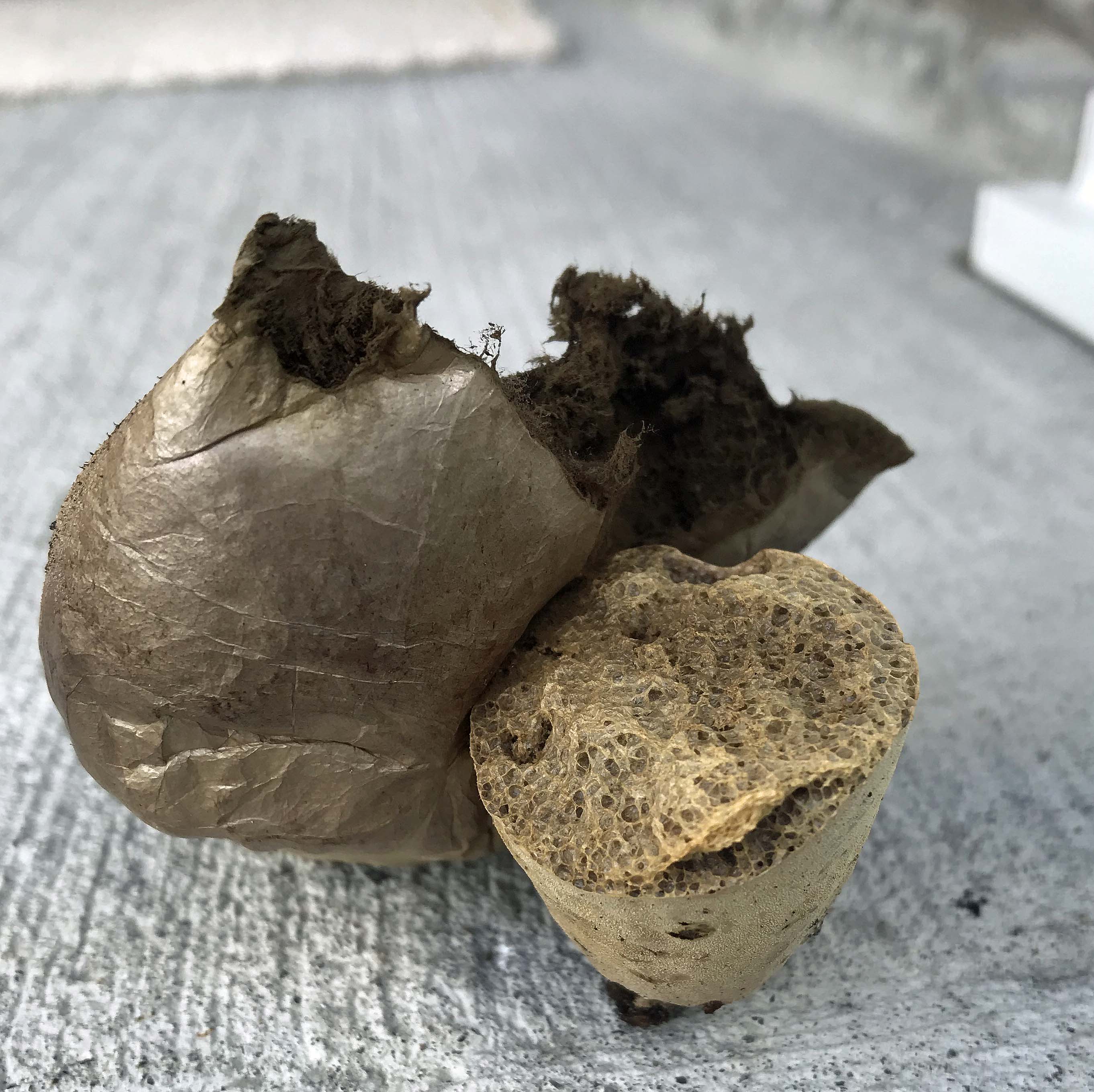 On one fall outing, I found a good-sized Calvatia excipuliforme that had not only ruptured at its upper pore, but had split in half where the globe (the gasterothecium) started. The split puffball showed a papery outer skin or peridium and the different insides of the puffball: the globe or gasterothecium, being totally dark brown inside with its powdery spore mass; and the neck or stalk below, still showing a reticulate fleshy sub-gleba interior. I also noticed, after picking up the two halves, that the lower neck or stalk, which is normally attached to the ground by its rhizomorph, also demonstrated a very low centre of gravity; whenever I pushed it over onto its side, it bounced up, righting itself to ‘stand up.’